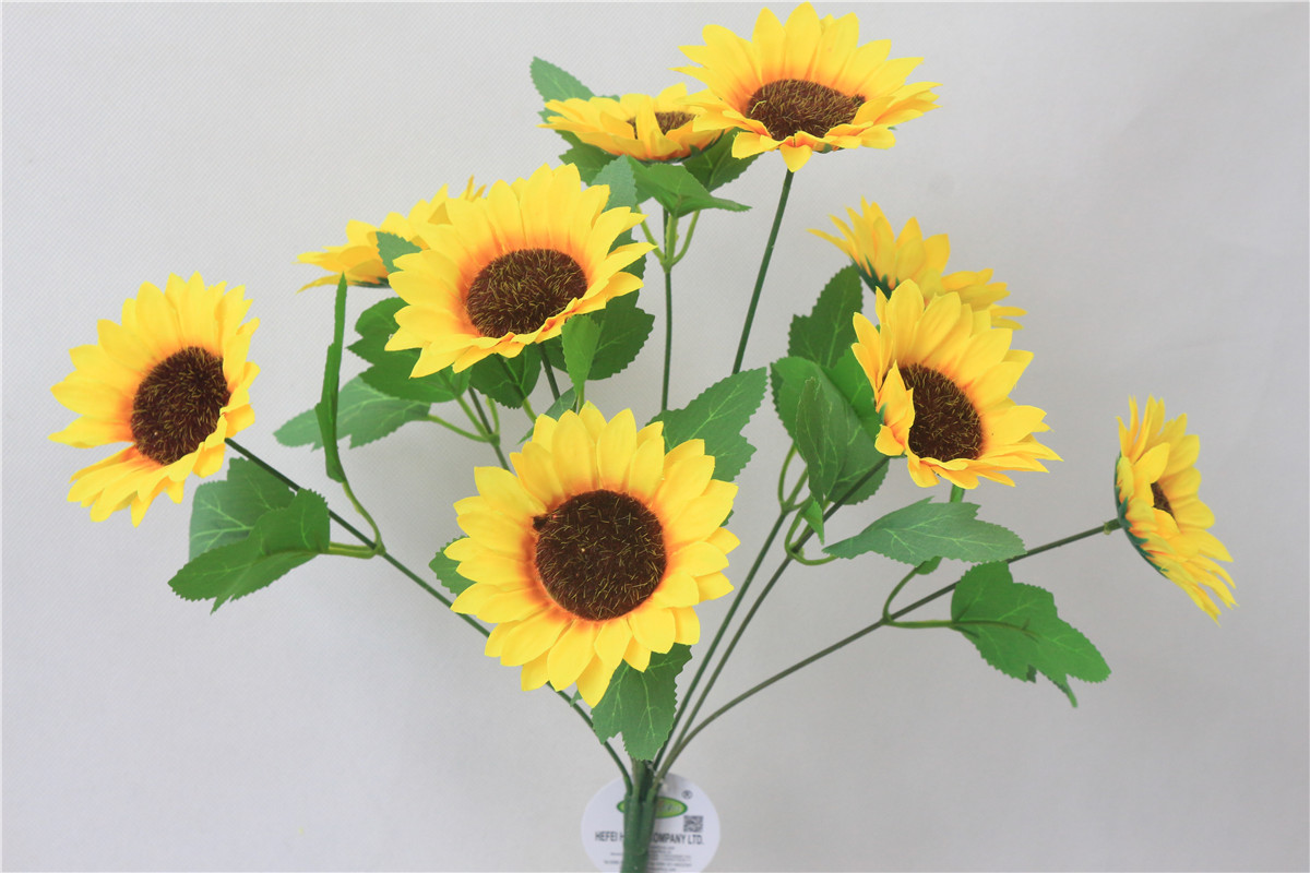 Description :40cm,9 branch sunflower,9 heads,dia:8cm,pongee,8 set lvs