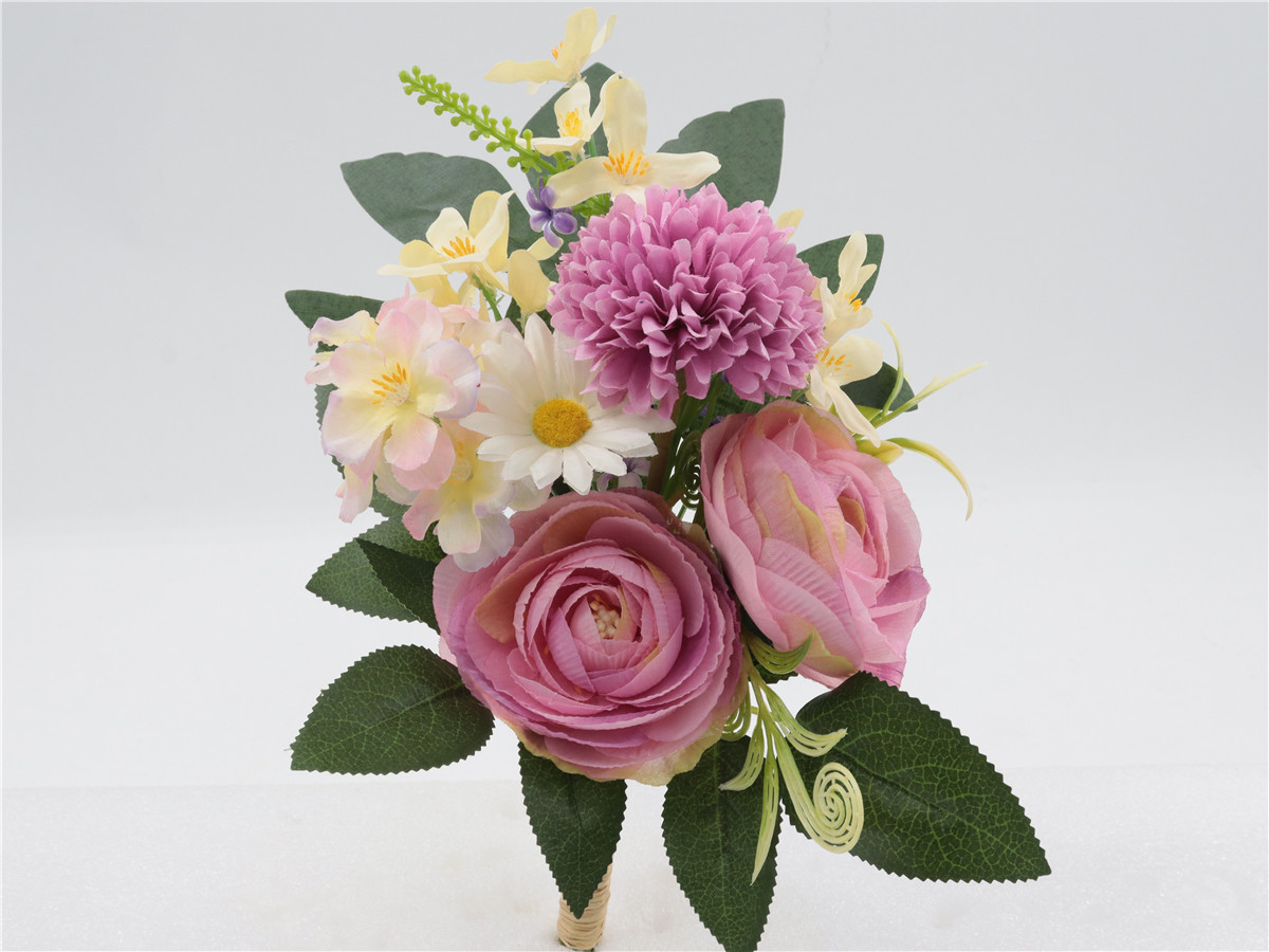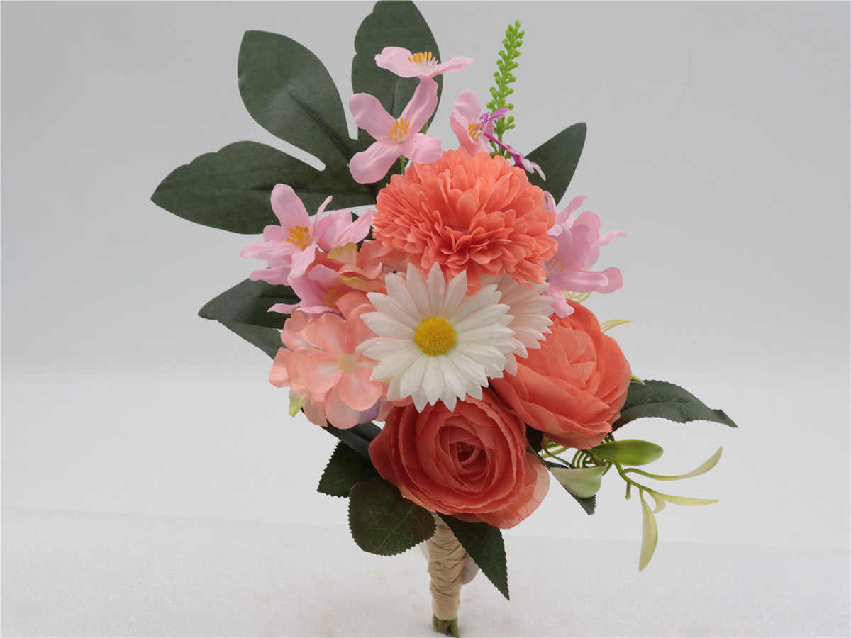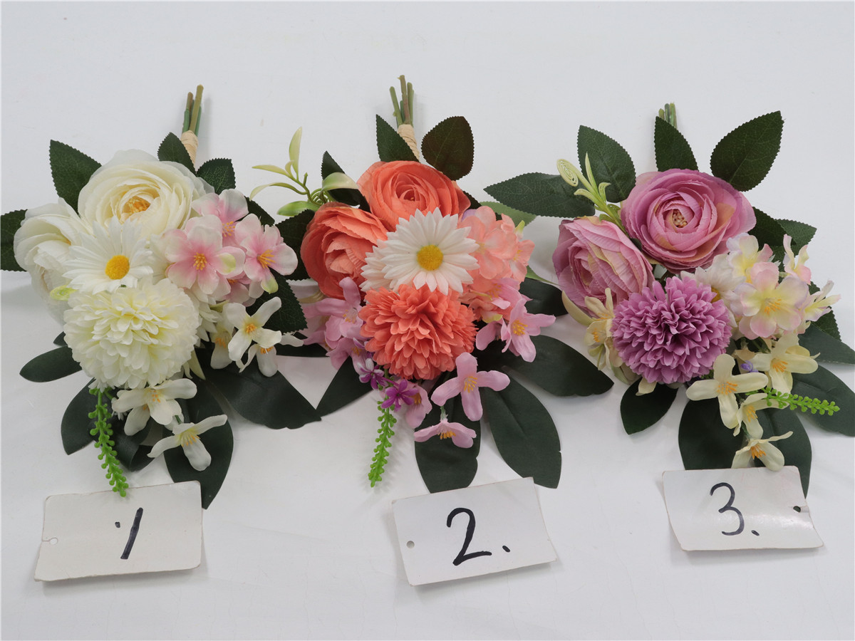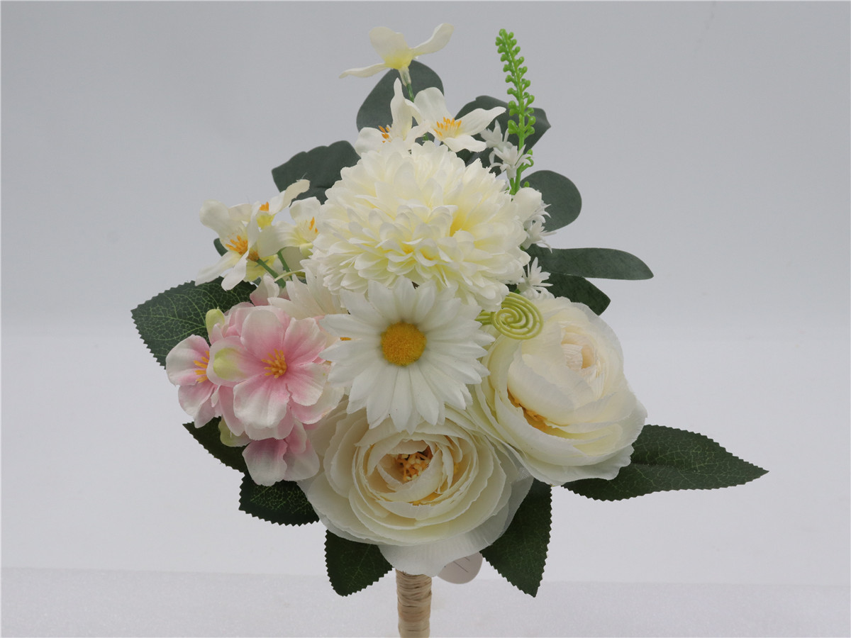 Description : 34cm, camellia Daisy needle Daisy head held, 2 camellia dia: 7cm, 3 Daisy dia: 5cm, 1 needle Daisy dia: 6cm, 4 leaves, 4 matching flowers, 1 plastic flower, pongee