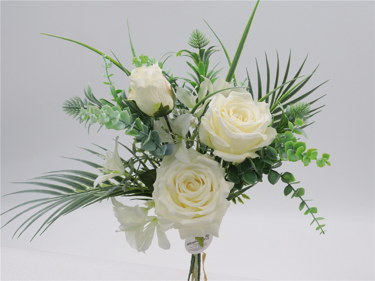 Description : 52cm,6 branch handheld rose&lily,2 rose, dia:10cm,1 bud, dia:4cm, micro-peach, 6 lily, dia:7cm, pongee, 2 sets of plastic leaves, 8 sets of eucalyptus leaves, 12 sets of grass, 3 sets of plastic accessories, raffie