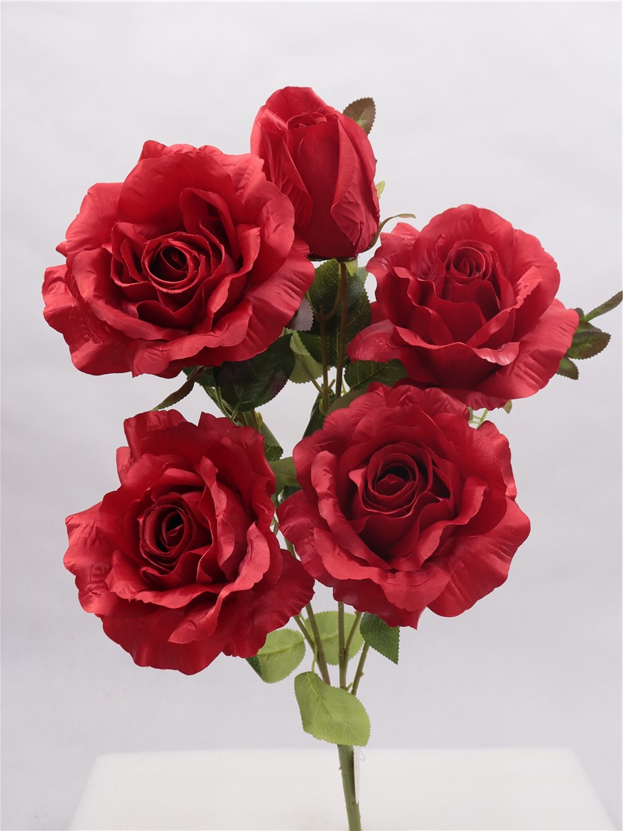 Description : 70cm,5 head big rose bouquet,4 flowers,dia:14cm,1 small flower,dia:7cm,12 big lvs,9 small lvs,satin
