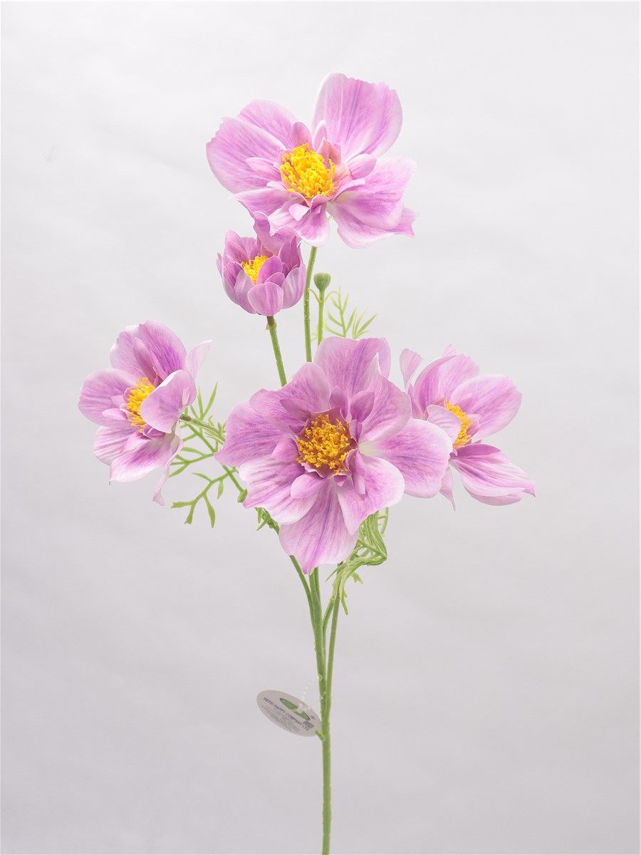 Description : 85cm,cosmos, 4big flowers, dia:10cm, 1small flowers, dia: 5cm, stem&lvs flocking, 5pcs plastic lvs, satin