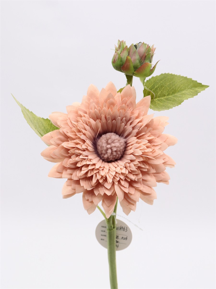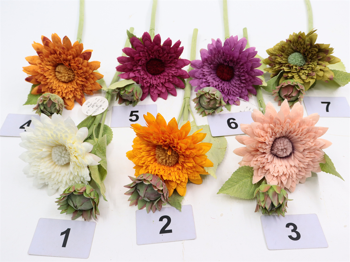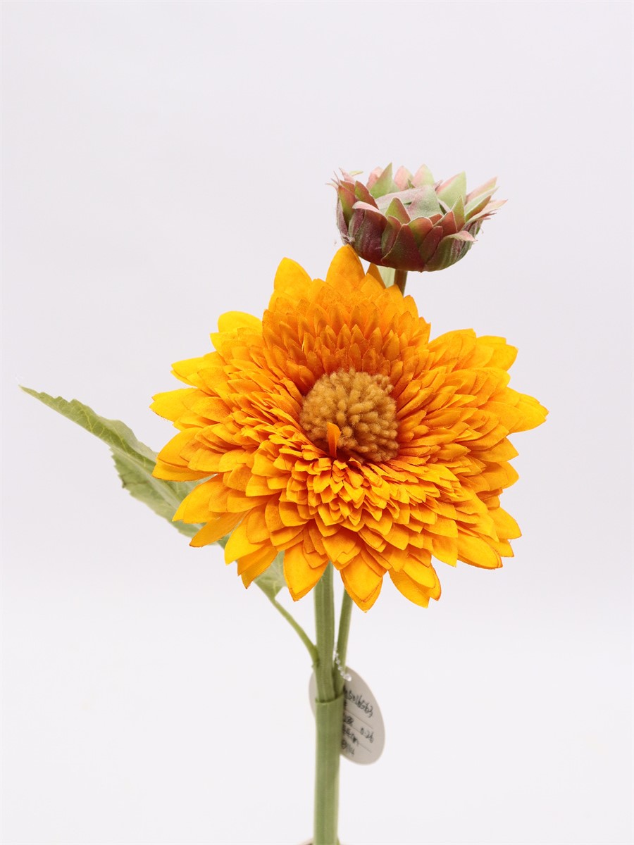 Description: 44cm,Single sunflower,1 flower Dia,1 bud,1 large lve,1 middle lve,1 small lve, flocking lve, flocking stem, flower bud plush ball,pongee