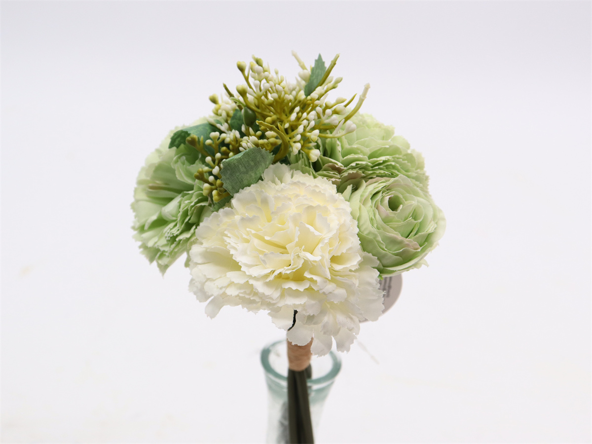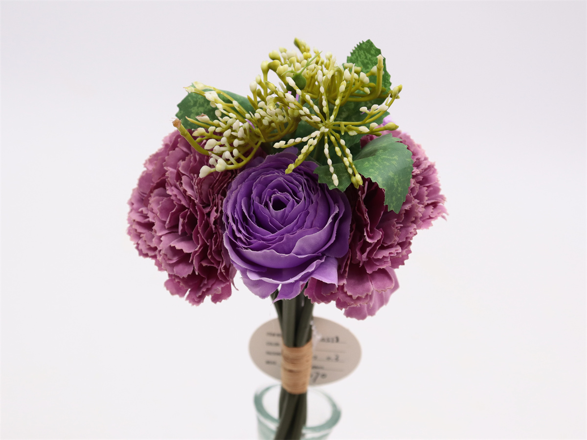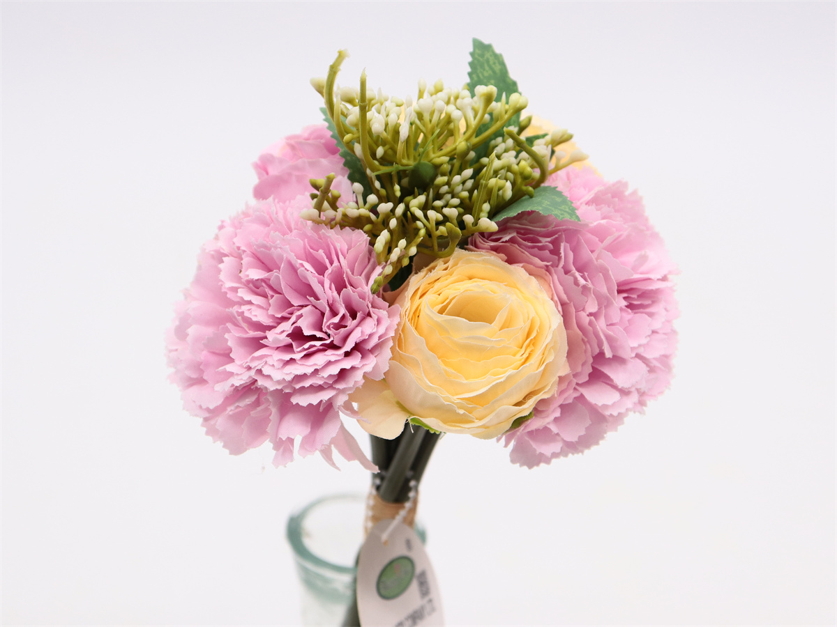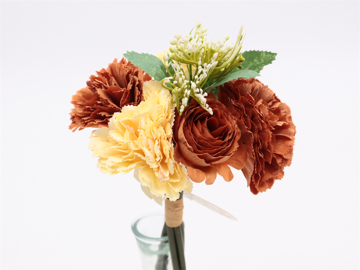 Description: 25cm,6 bunch carnations handheld,Bouquet of roses,3 Carnations Dia:7cm,2 rose Dia:4cm,1 sets of lvs,1 sets of plastic accessories,raffia grass,pongee