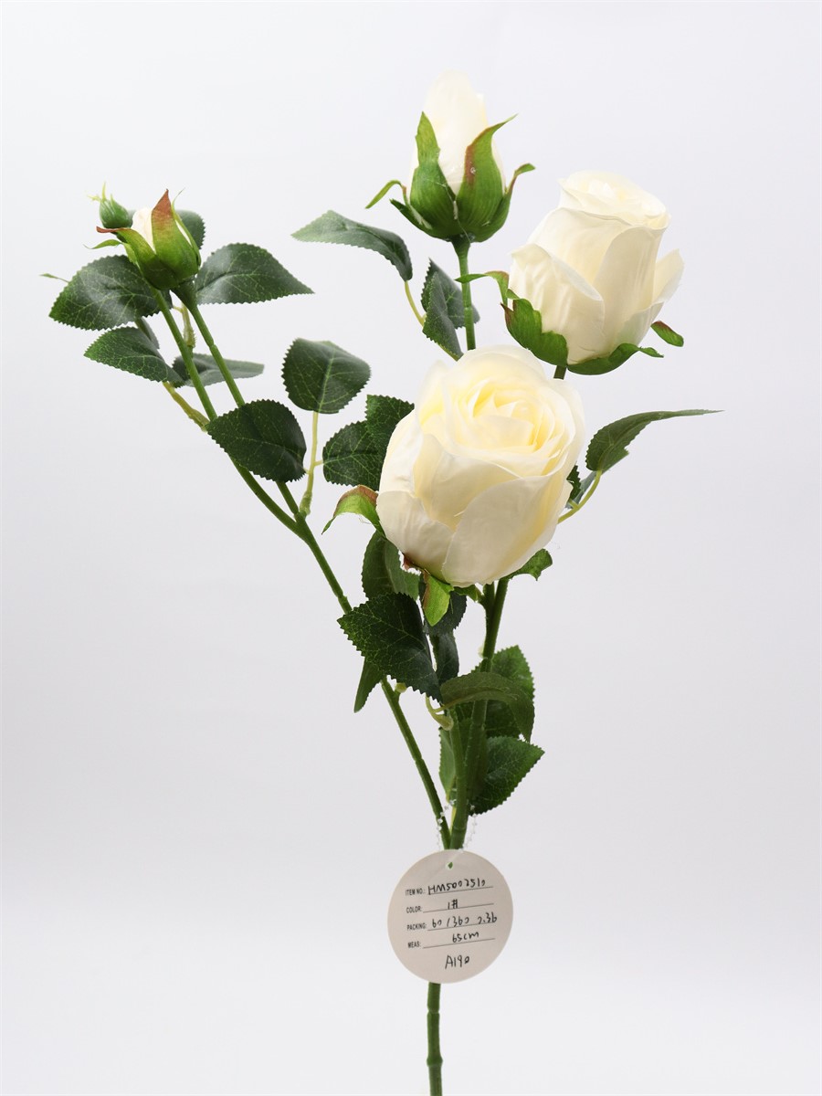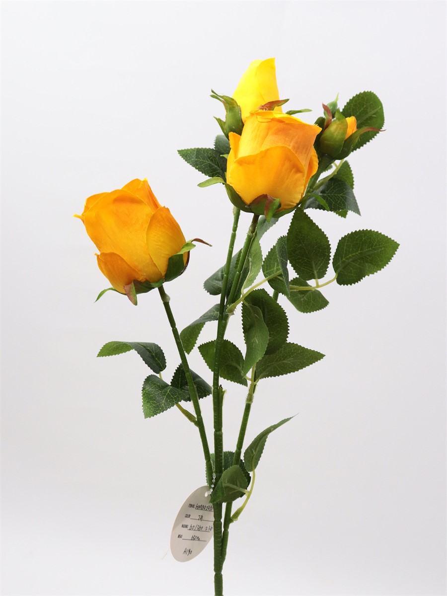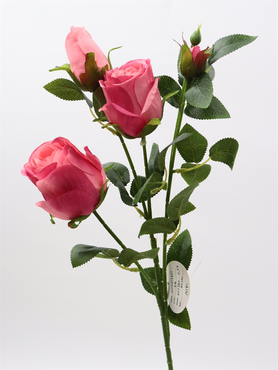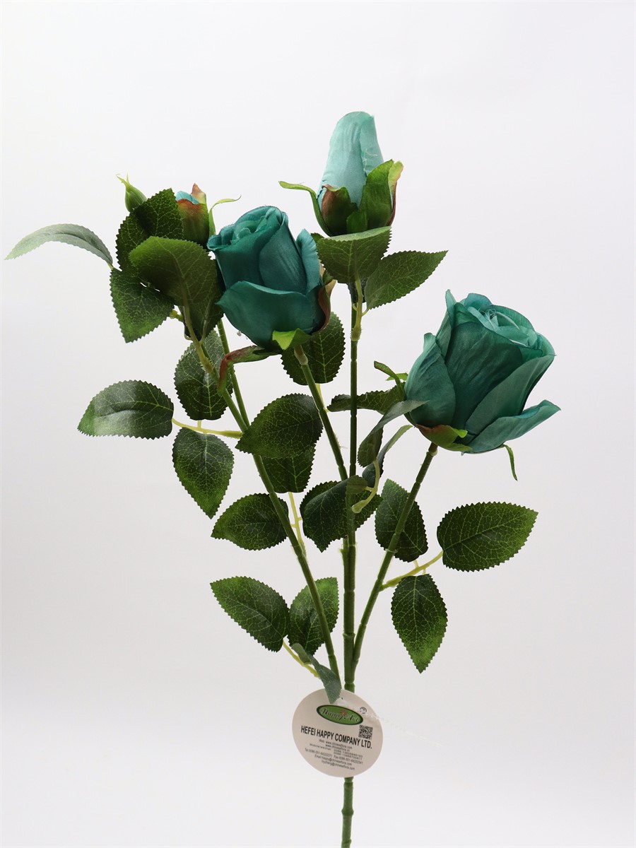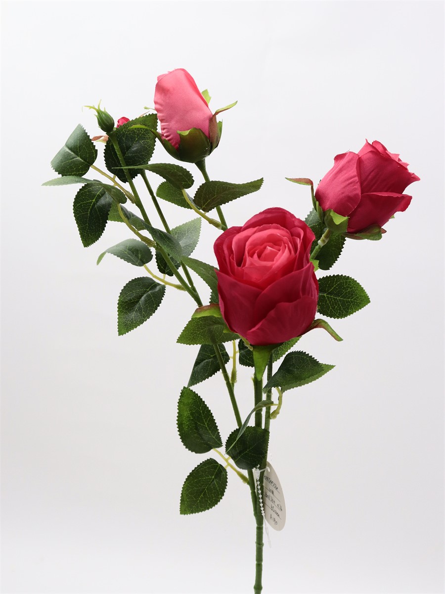 Description:65cm, single 4 head rose,1 large flower,D:5cm,1 medium flower,D:4cm,2 flower buds,9 sets of printed fabric leaves, Pan weaving