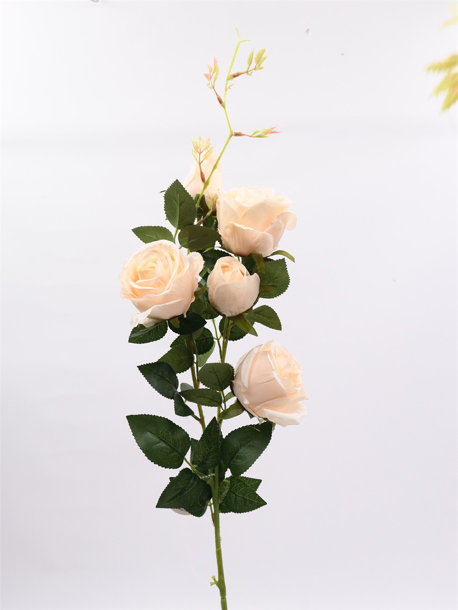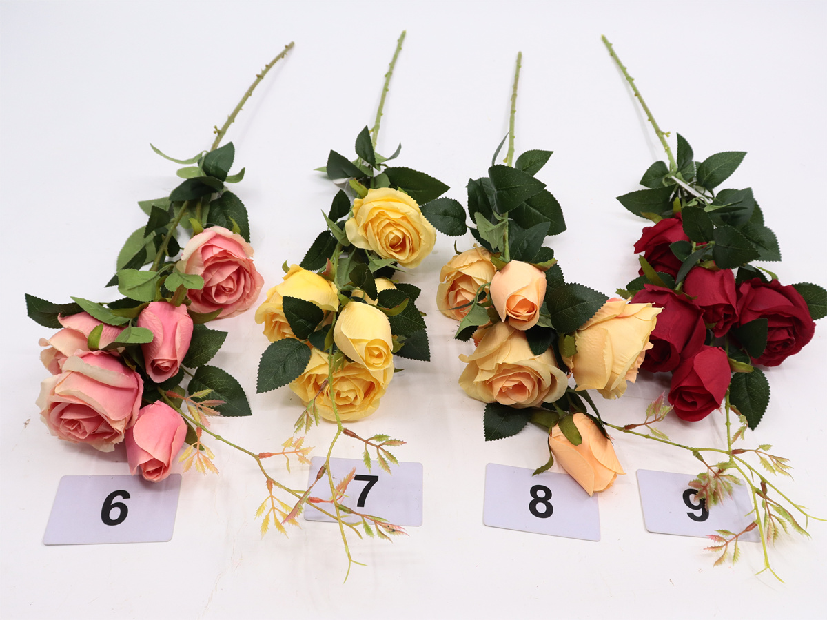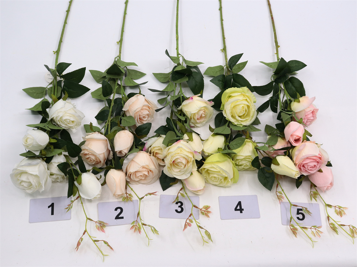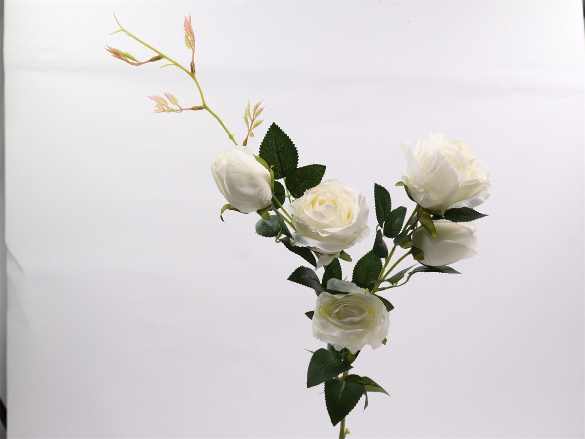 Description:73cm, Single 5 head roses, 3 flowers, dia: 8cm, 2 flower buds, 12 sets of printed silk leaves, pongee