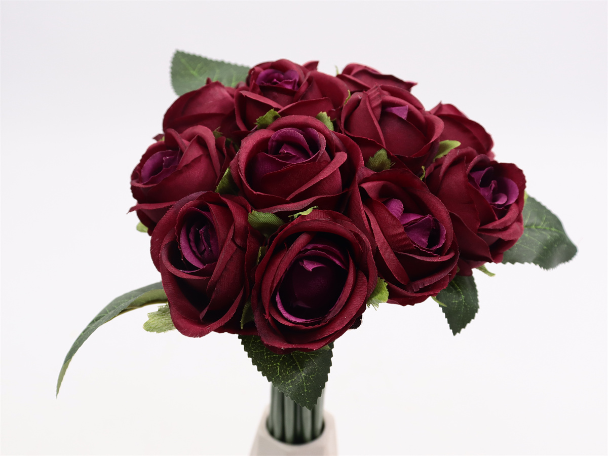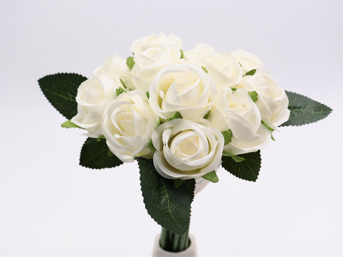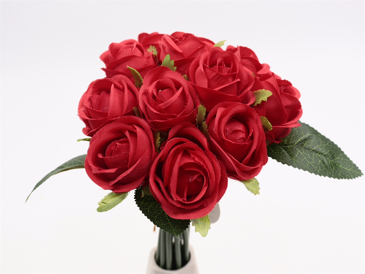 Description:27cm,12 head rose handheld,12 flowers, DIA:4cm, leather tube,1 lafite grass,Pan weave,3 printed fabric leaves