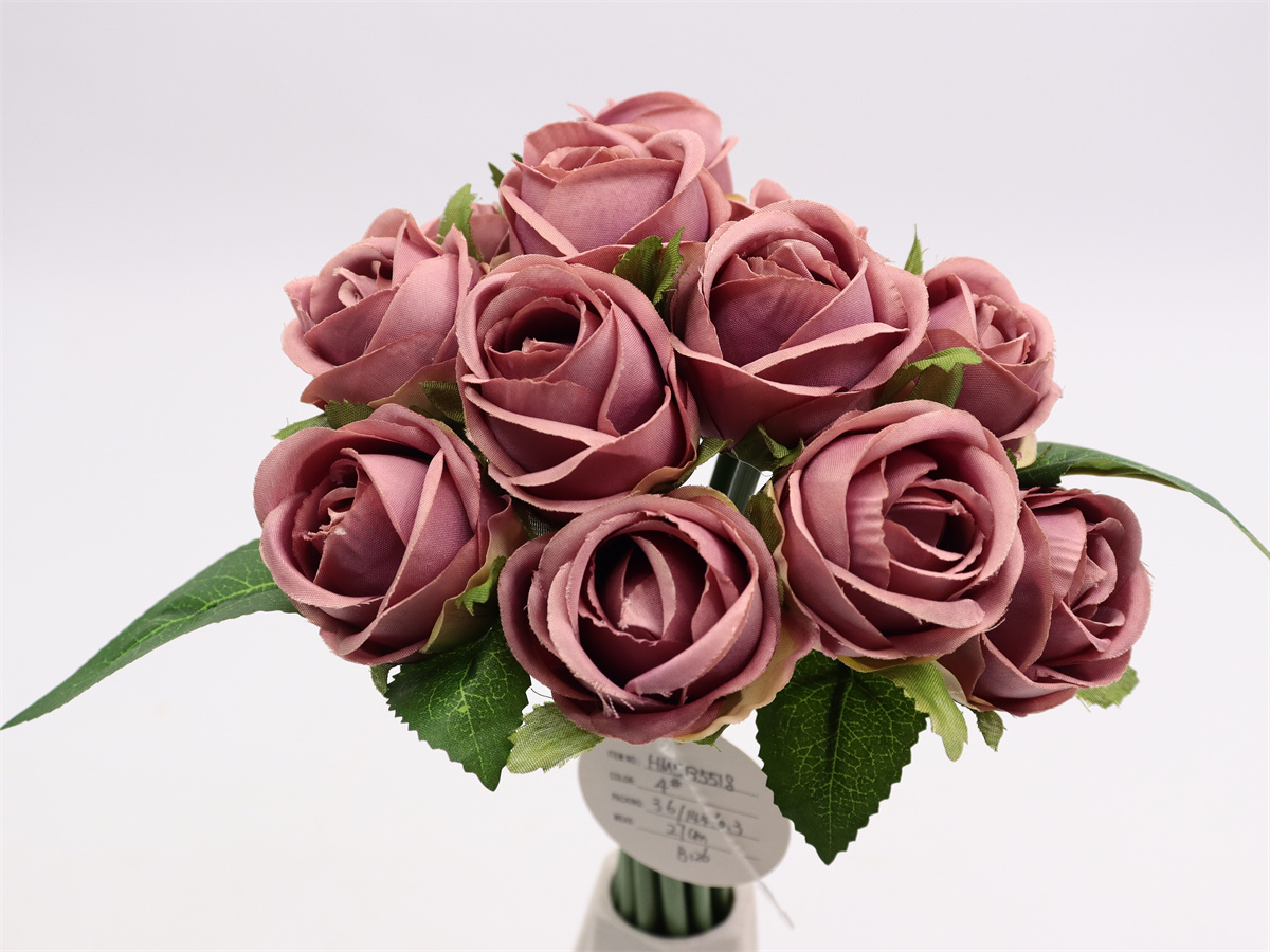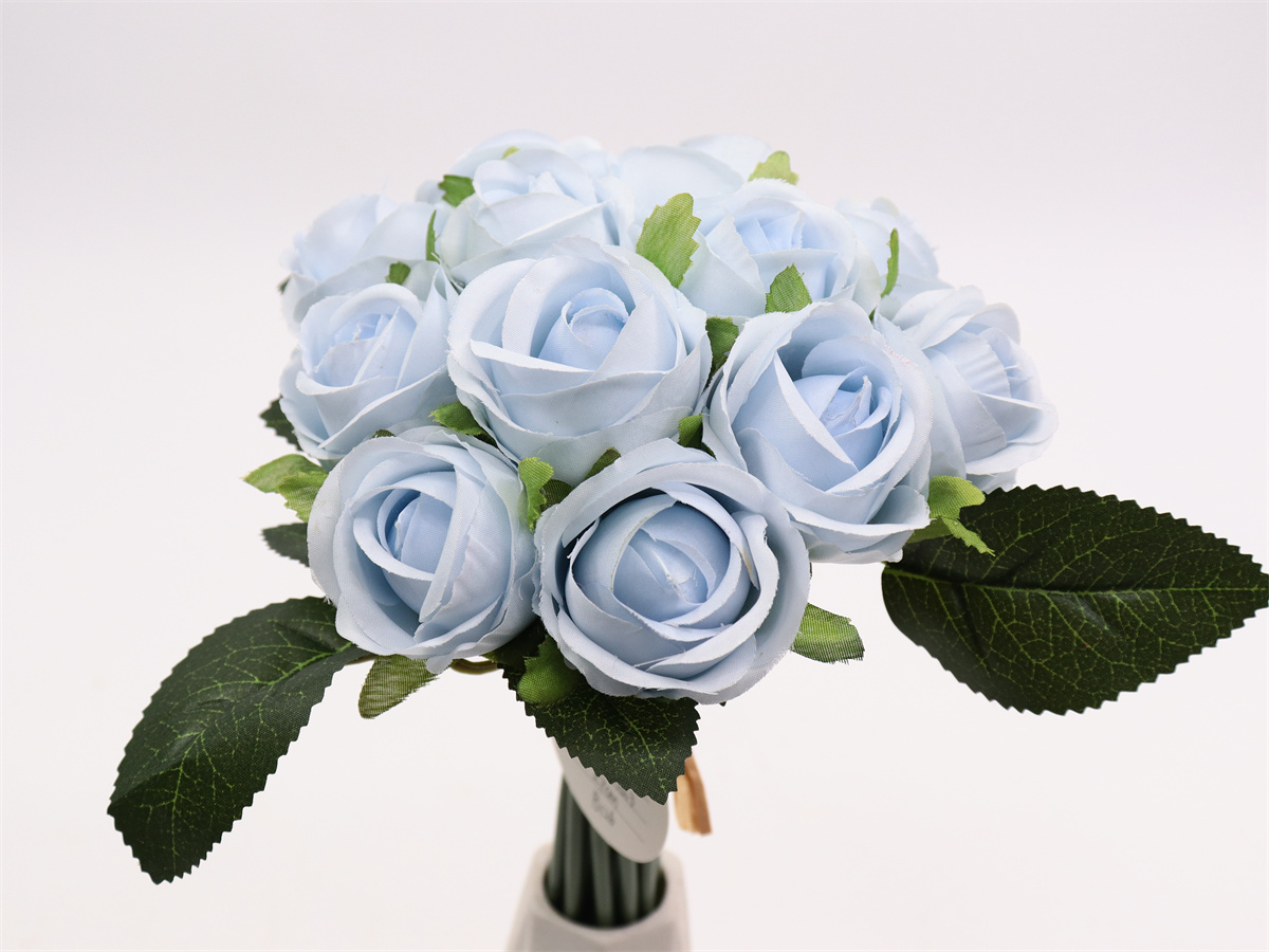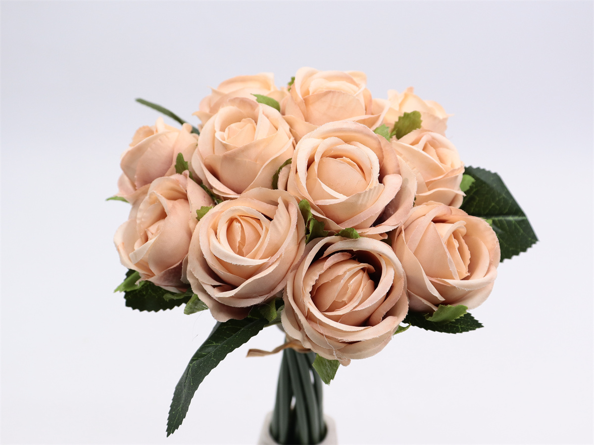 Description:27cm,12 head rose handheld,12 flowers, DIA:4cm, leather tube,1 lafite grass,Pan weave,3 printed fabric leaves