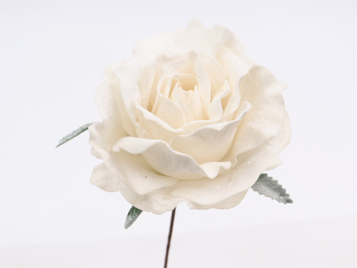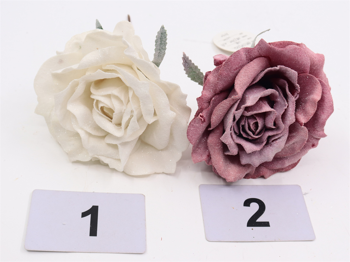 Description:21cm, Single Christmas rose skewer, Dia=12.5cm, Flocking and sprinkle gold