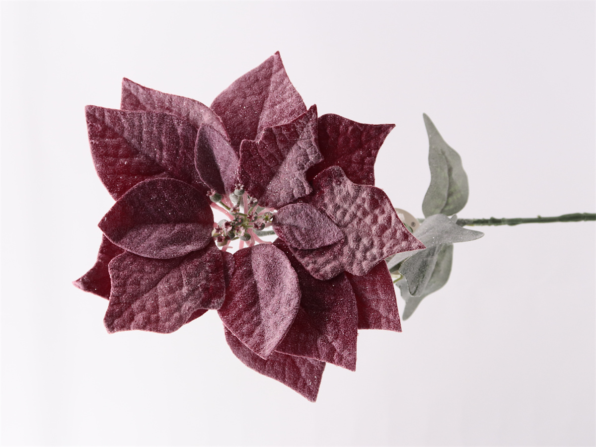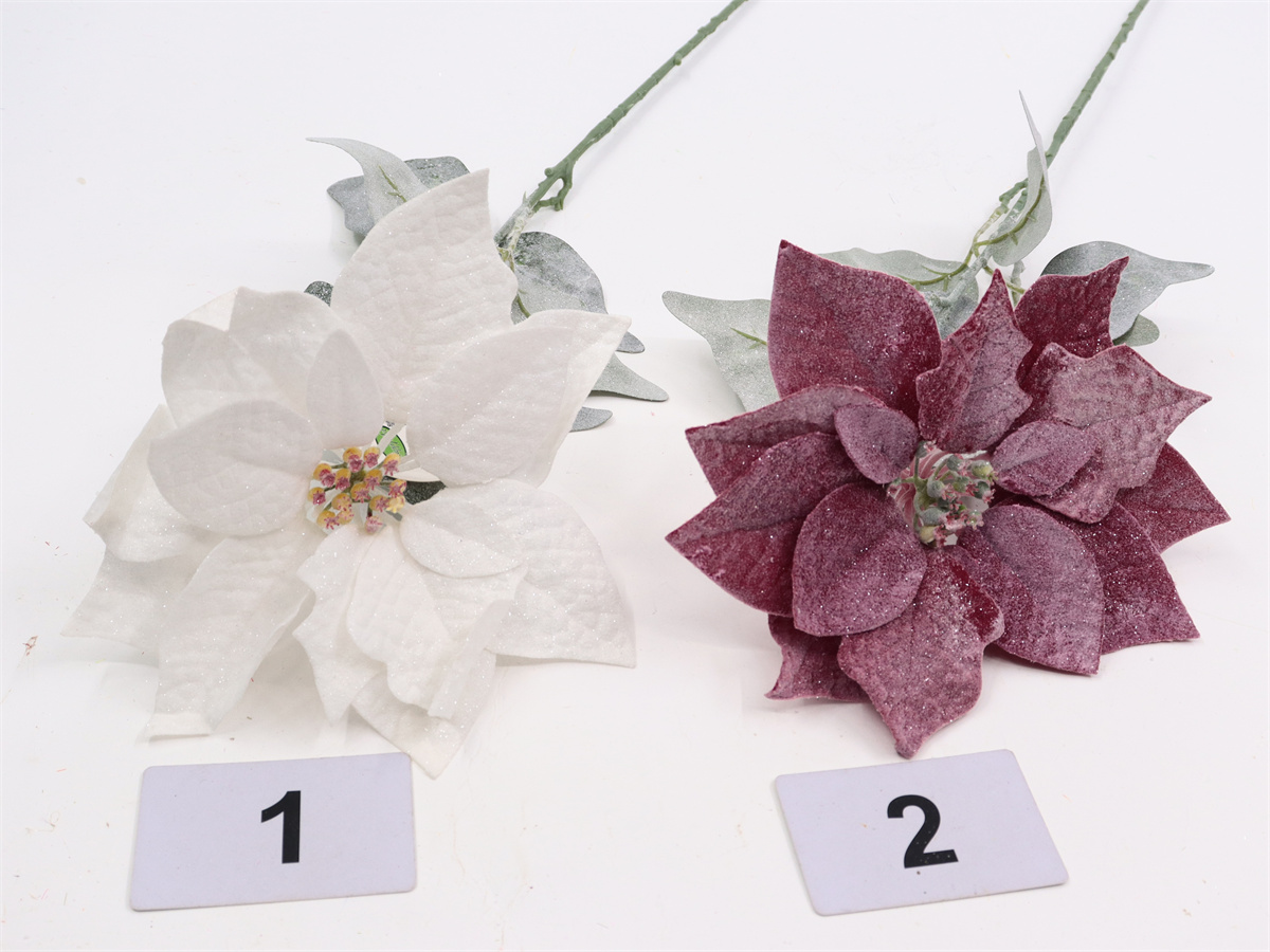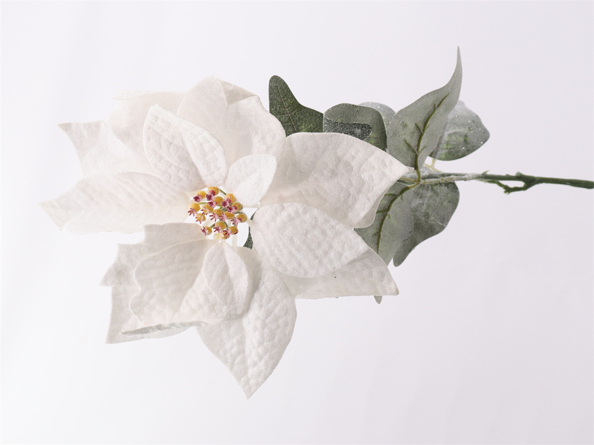 Description:71cm, A single Christmas flower, Dia=22.5cm, 3 leaves, Flocking and sprinkled with gold (leaves+flower head)