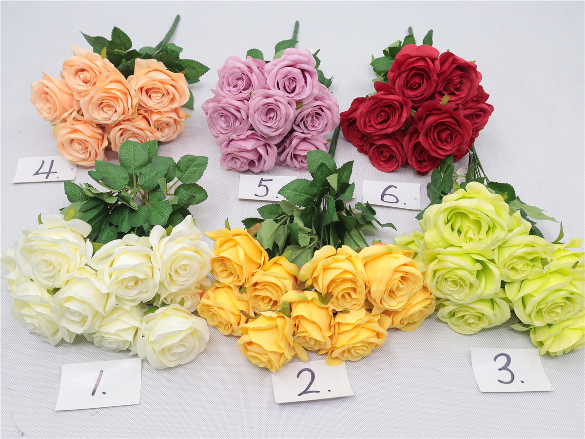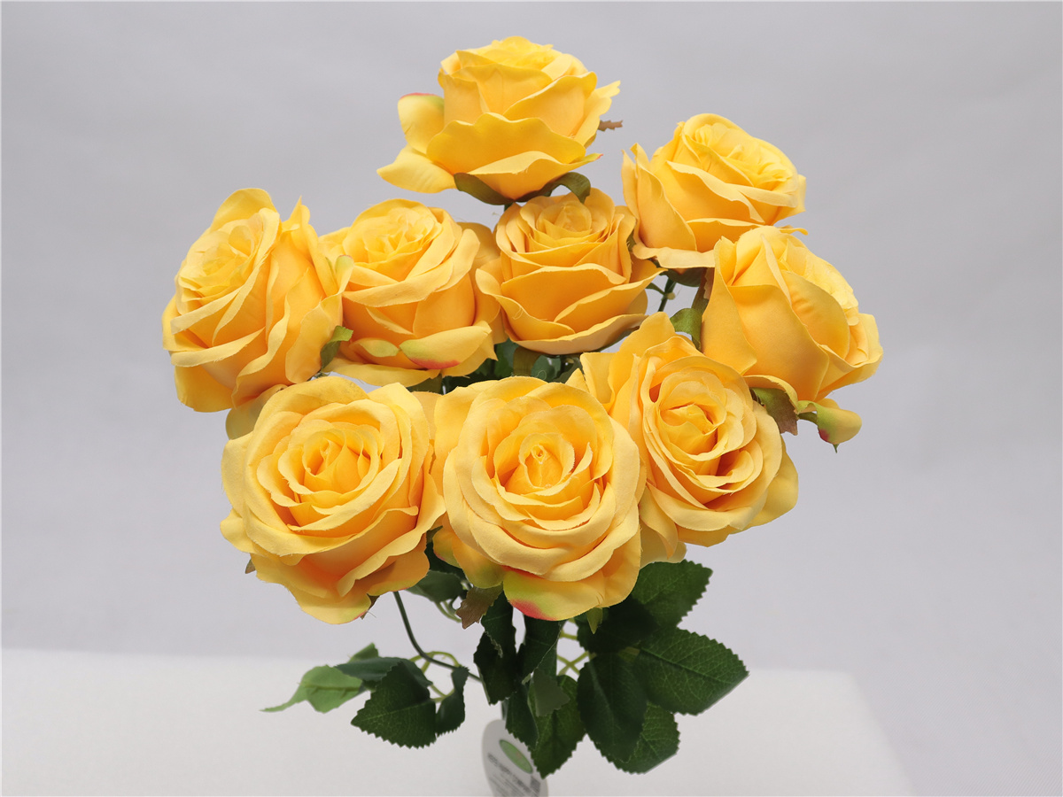 Description : 41cm,9 head rose bouquet,single 9 bunch,9 flowers,dia:8cm,9 set of lvs,pongee