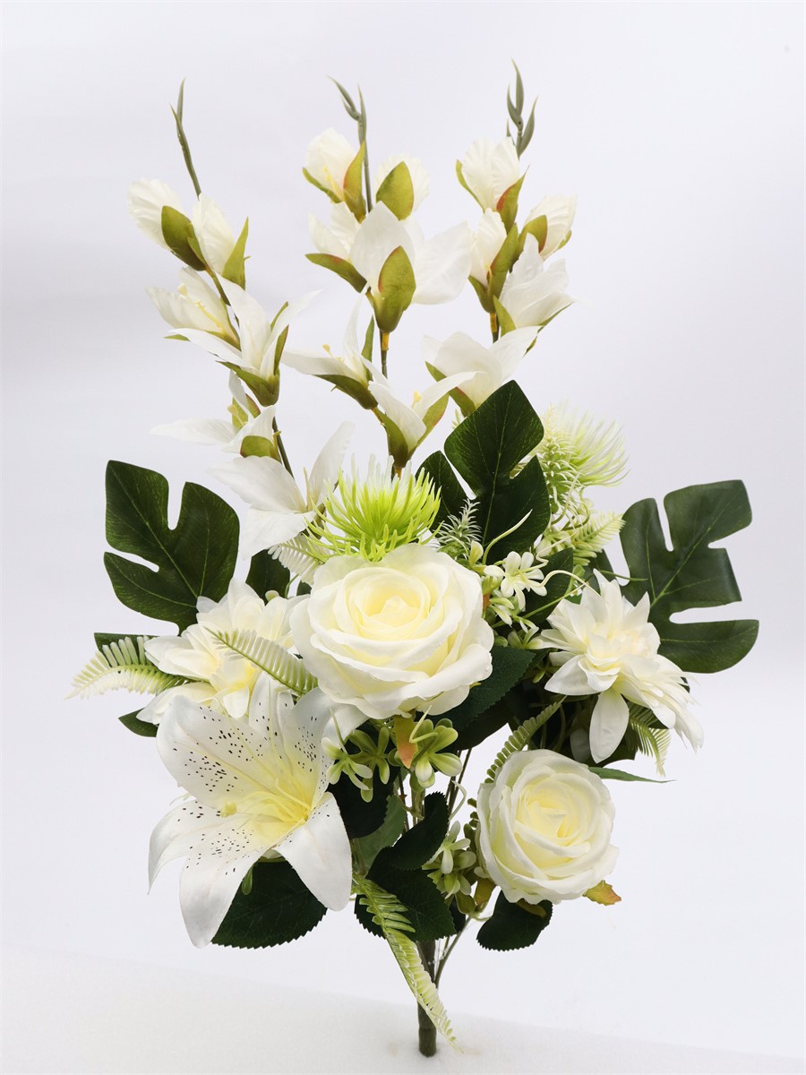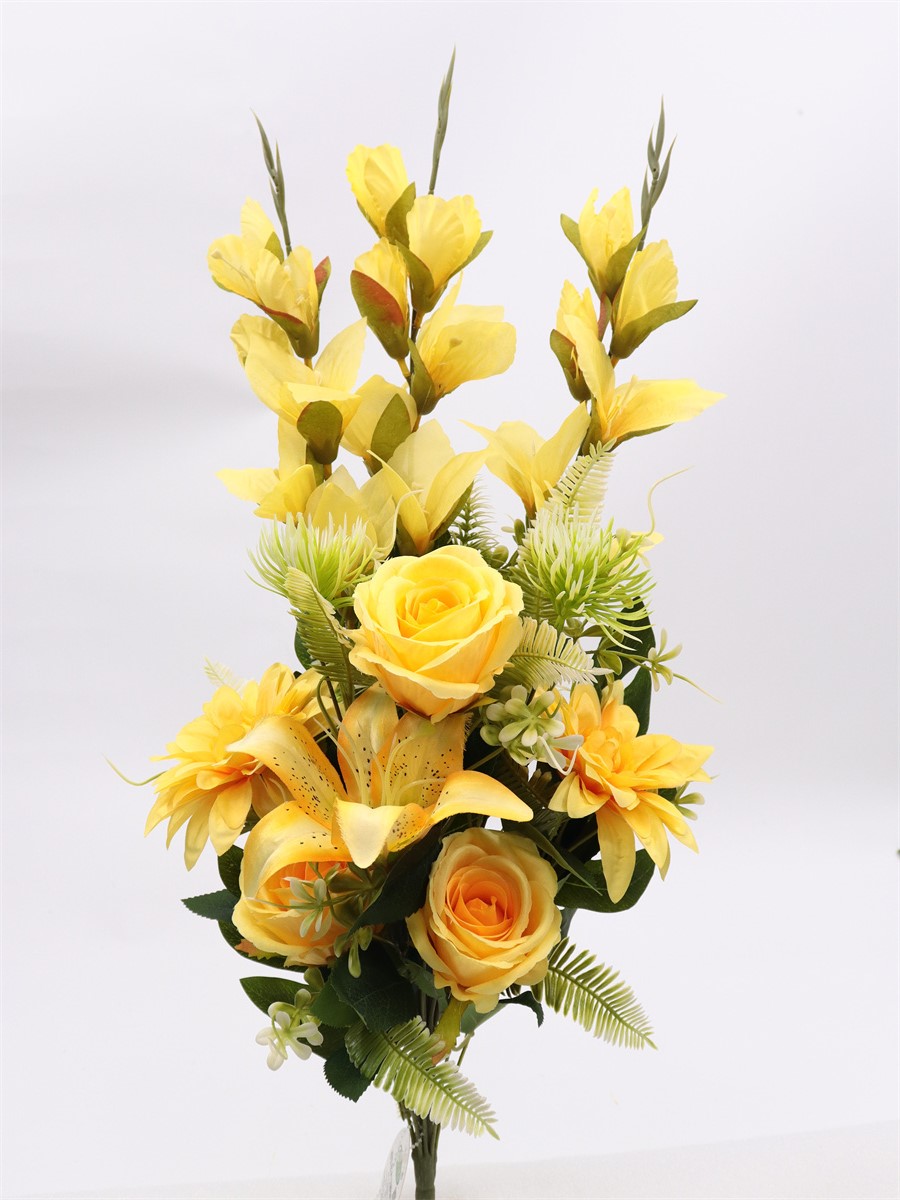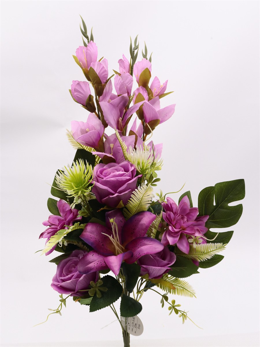 Description:69CM, 13-branch fan-shaped roses, lilies, dahlias and gladioli bush, 1 lily D14CM, satin; 3 rose flowers D8CM, pongee; 2 Dahlias D12CM, pongee; 3X3=9 gladioli, 3X3=9 buds, pongee; 3 turtle-back leaves, 9 sets of printed fabric leaves, 10 sets of plastic grass, 4 sets of plastic accessories