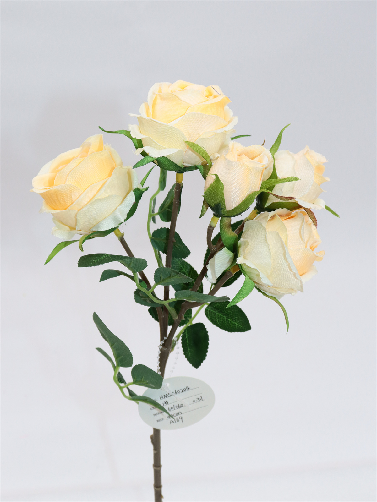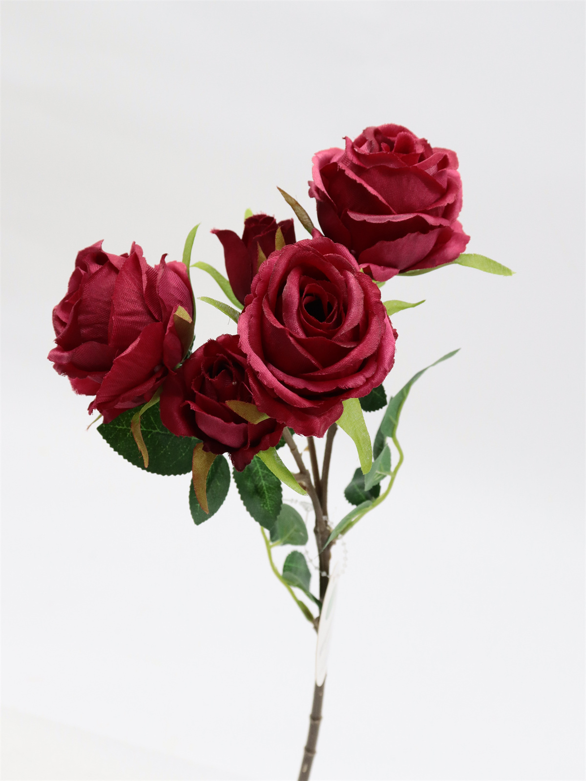 Description:40CM/30g,single 3 bunch rose,5 head,3 large DIA6CM,1 middle DIA4CM,1 small DIA3CM,3 set printed lvs,matte fabric