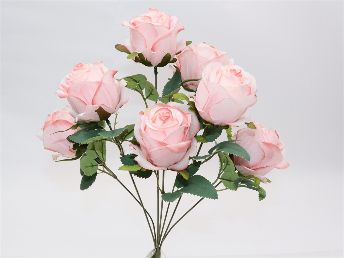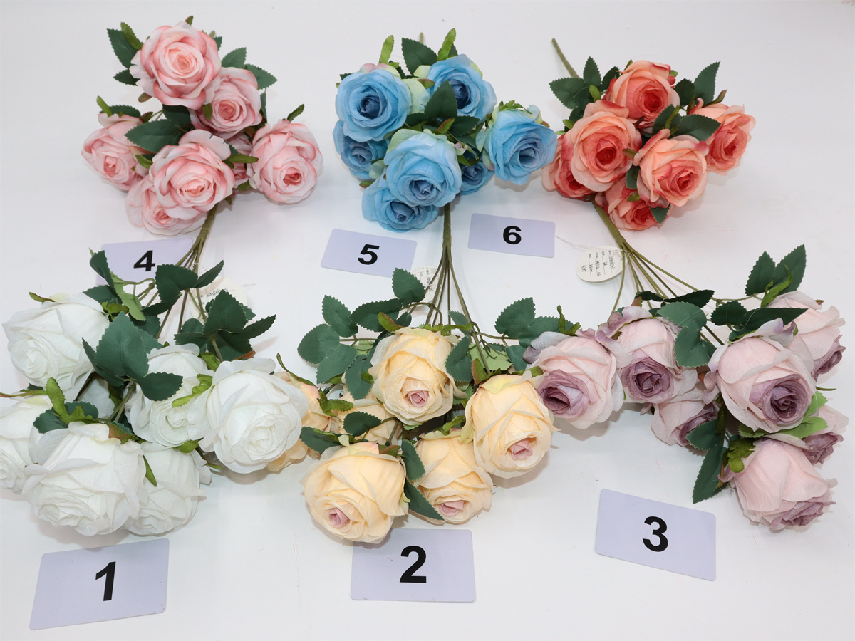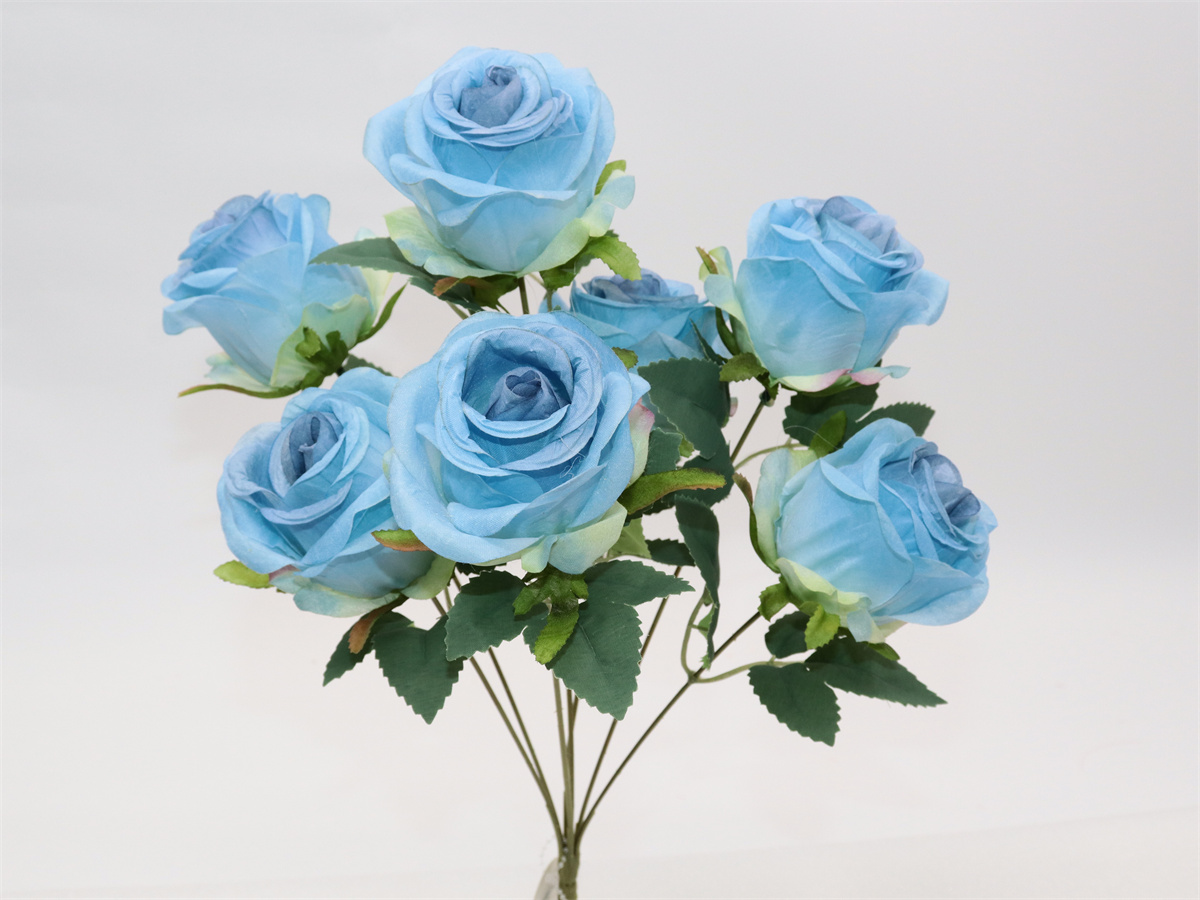 Description:44cm,7 forks rose bouquet,7 flowers, dia:7cm; 7 sets of leaves, non-woven fabric;