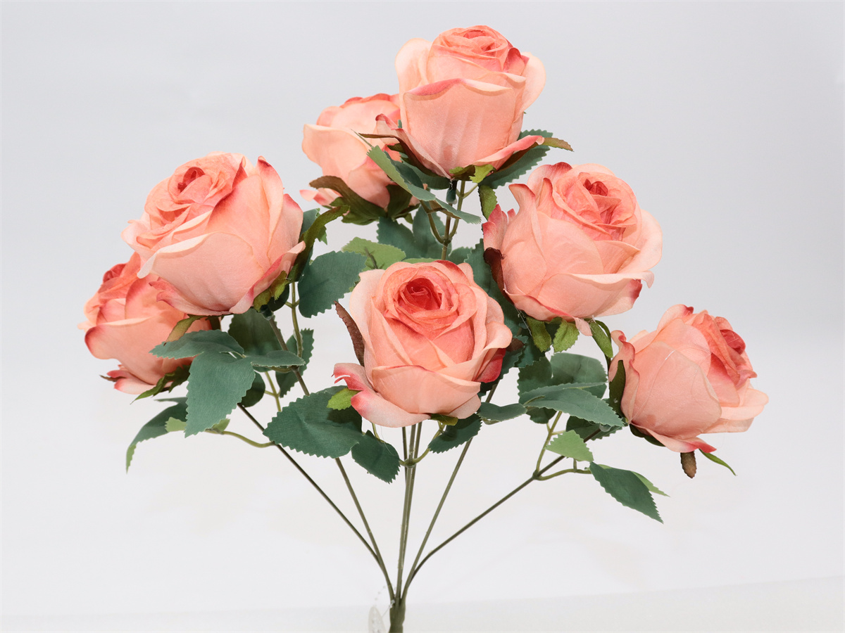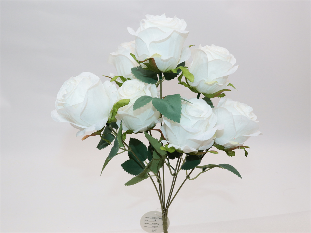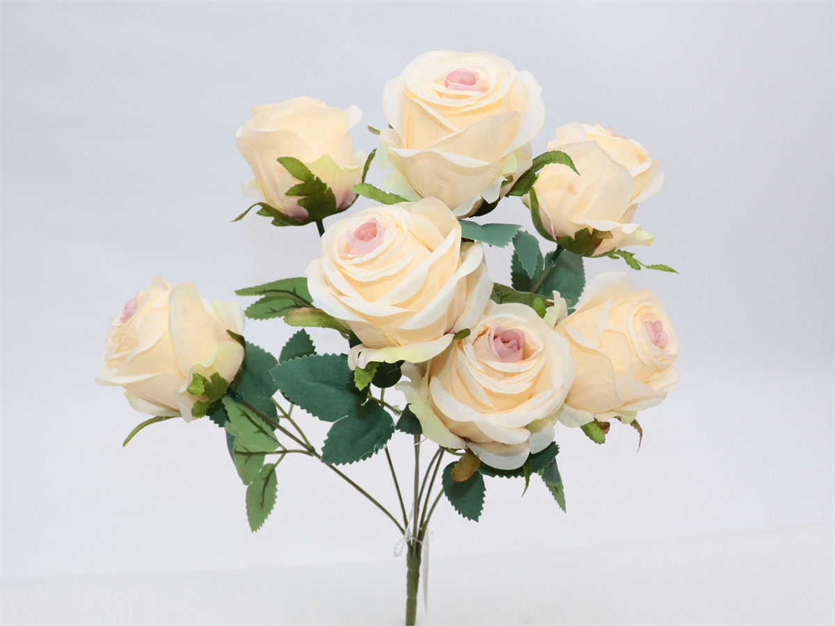 Description:44cm,7 forks rose bouquet,7 flowers, dia:7cm; 7 sets of leaves, non-woven fabric;