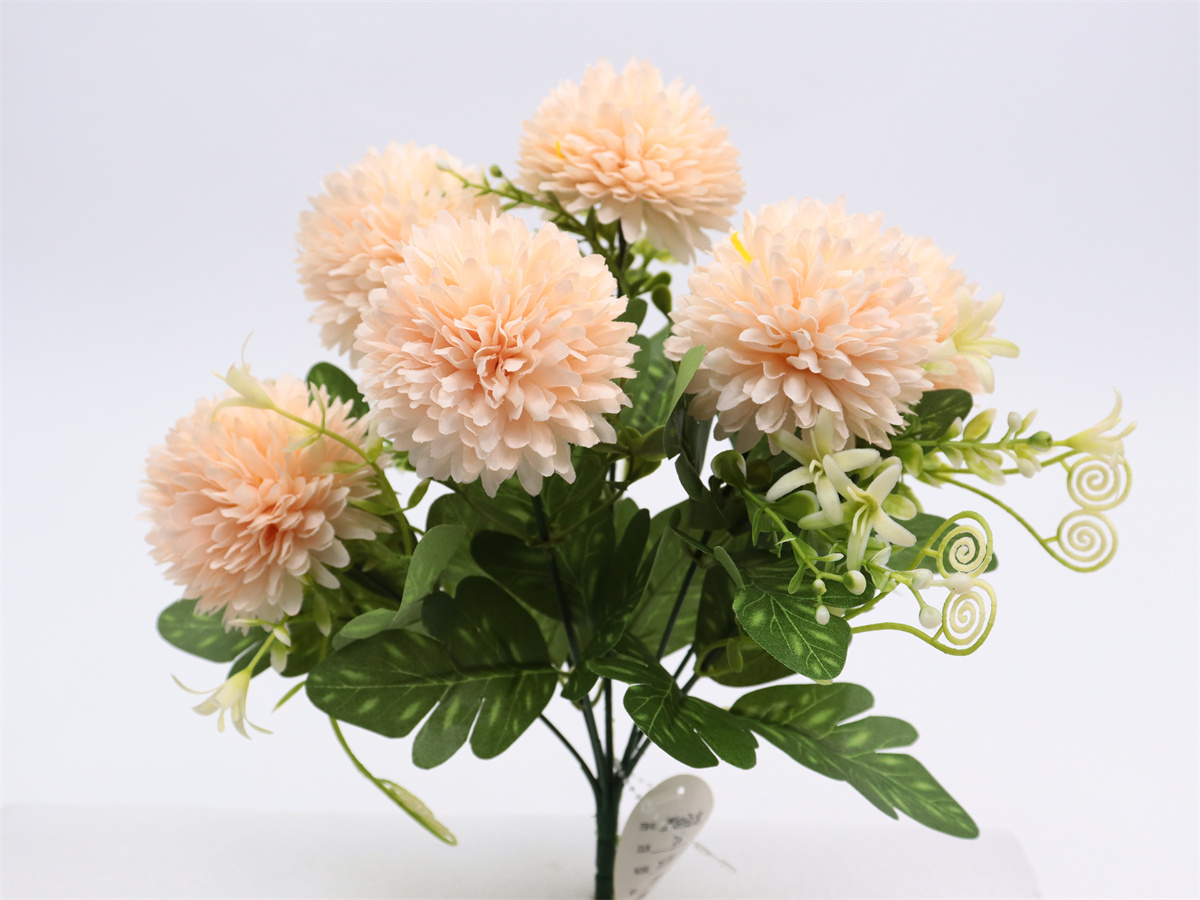Description:30cm, 7 bunch ball chrysanthemum bush, 7 flowers, dia: 6.5cm, 7 sets printed silk leaves, 7 sets plastic grass,pongee