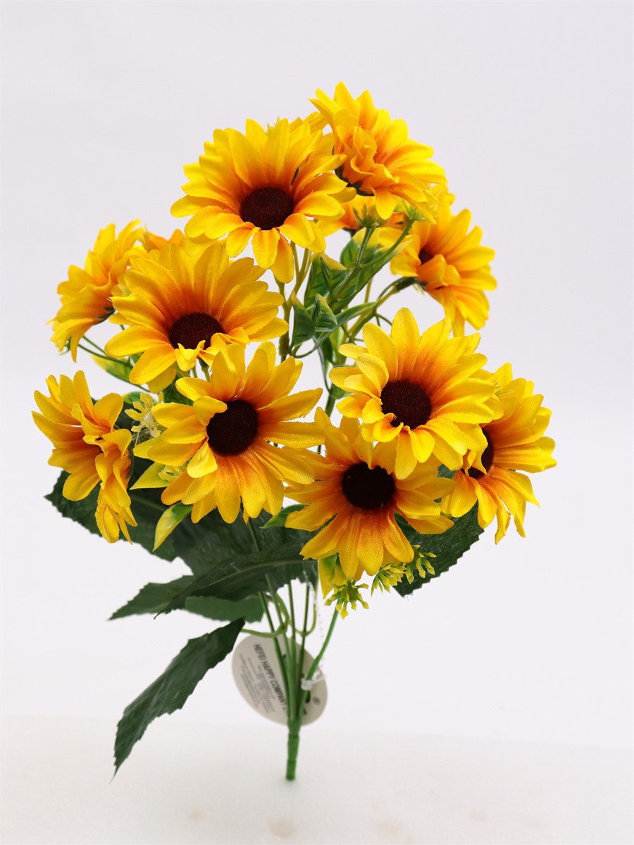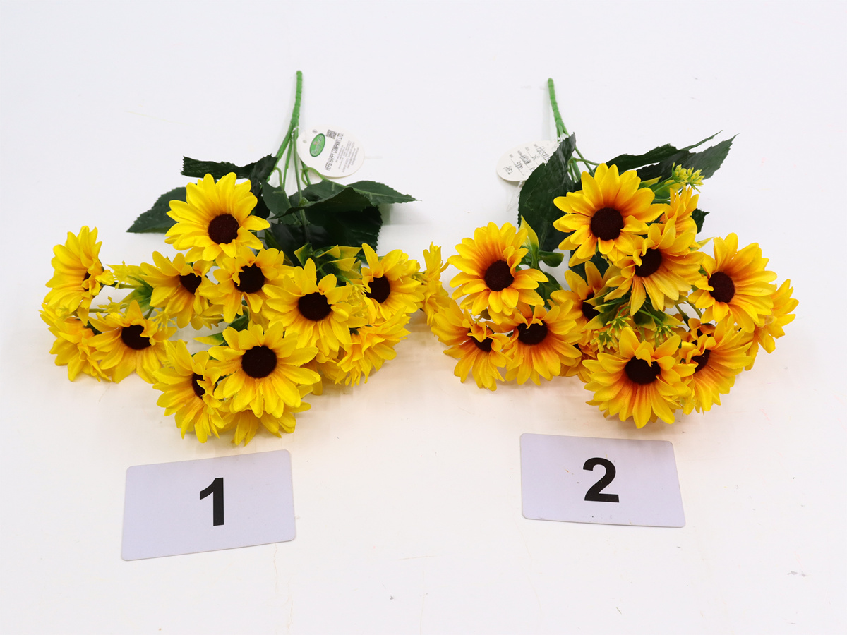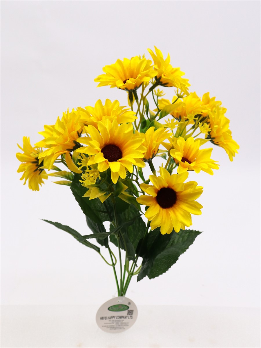 Description:37cm,5 branches sunflower, 5 * 3 flower heads, dia:6cm, 4 sets of leaves, 5 sets of plastic leaves, stain