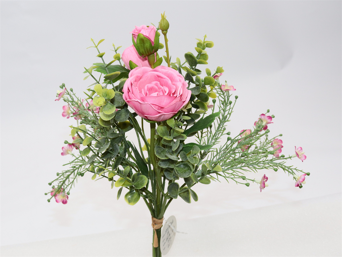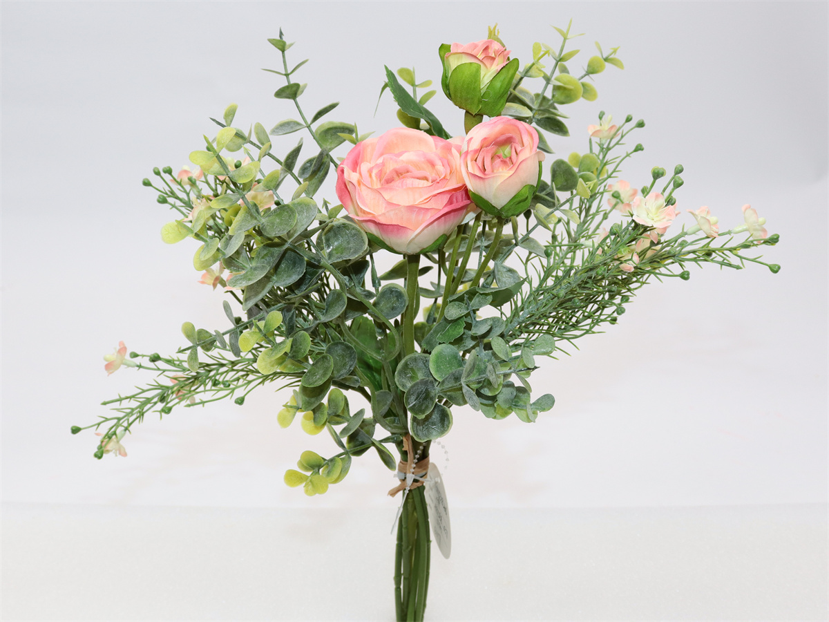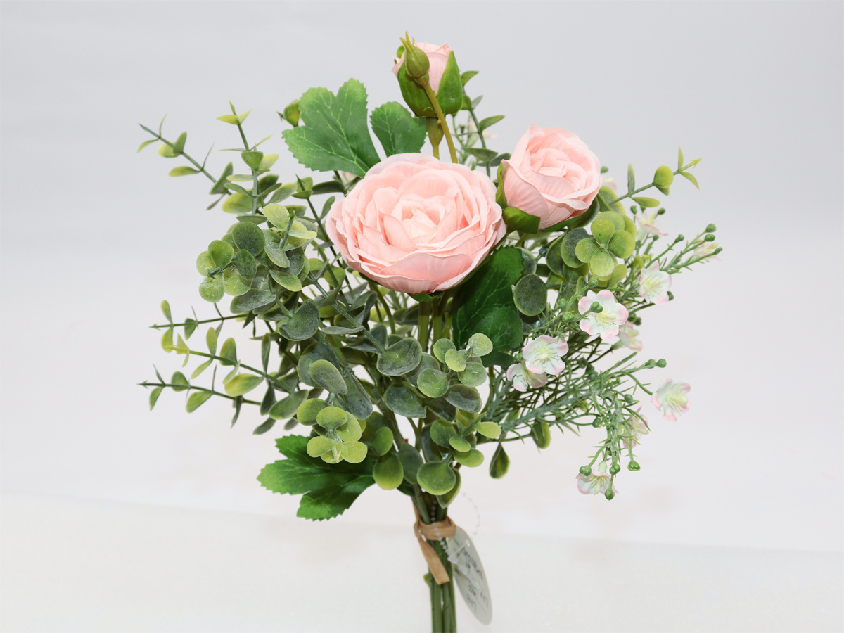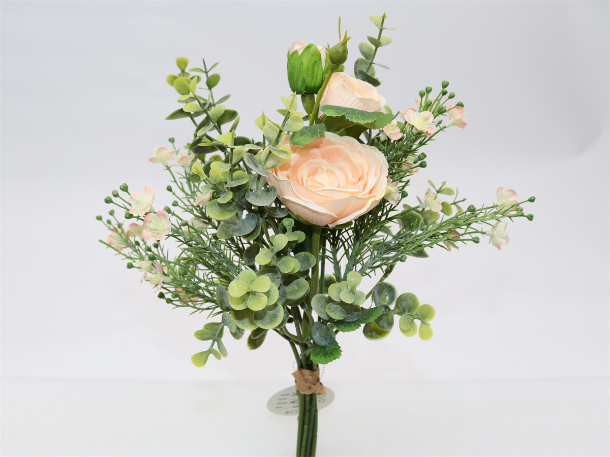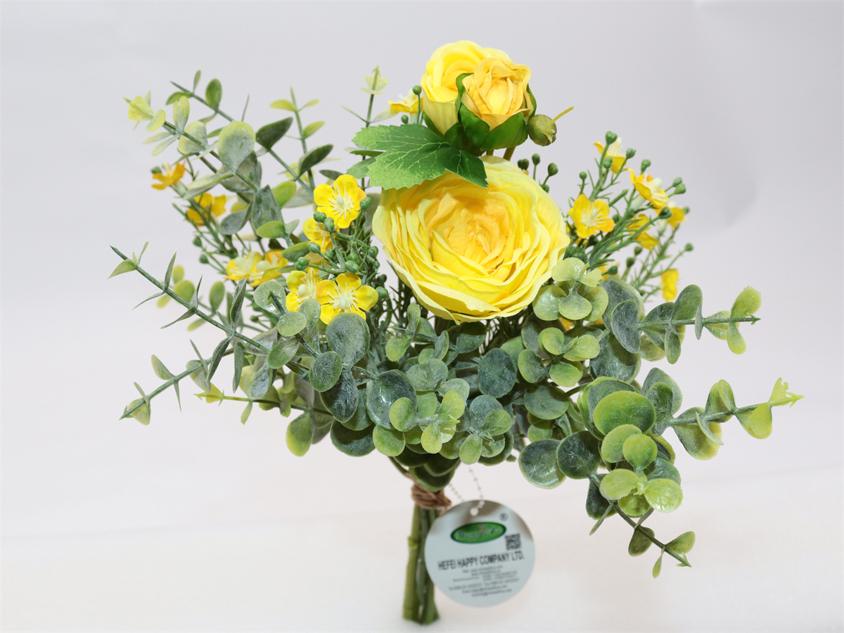 Description:35cm, Loula in hand, 1 large flower, dia:6.5cm, 1 small flower, dia:3.5cm, 1 bud, 3*10 plastic eucalyptus; 2 dominant flowers, 2 printed leaves, 1 Lafite, Pongee;