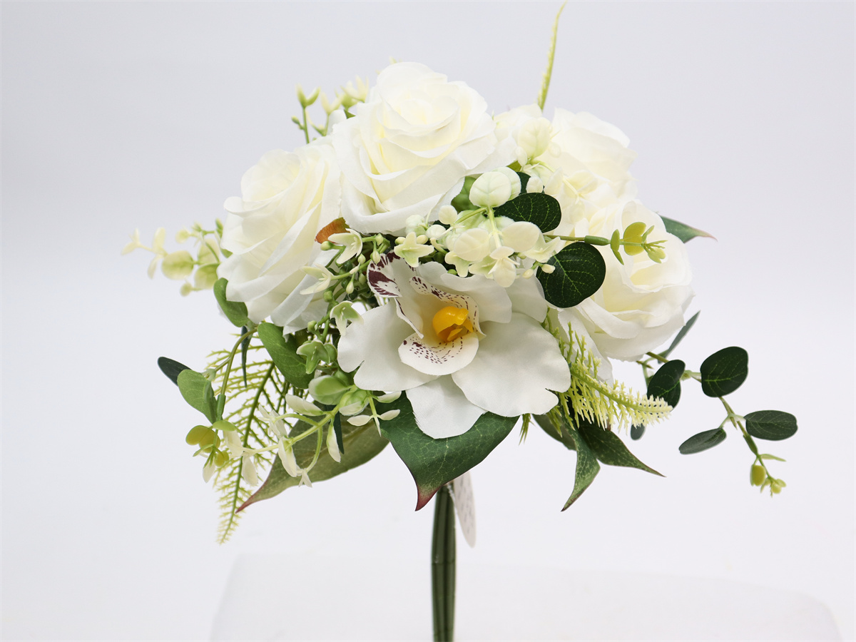 Description:38cm, 7 bunch rose and phalaenopsis handheld,4 roses,DIA:9cm,3 Phalaenopsis (with plastic center),3 plastic pine and cypress leaves,3 sets of cloth leaves,3 eucalyptus leaves,4 plastic accessories, satin