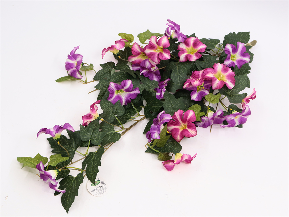 Description:83 cm,6 bunch hanging wall morning glory.23 flower,DIA: 9 cm,33 set lvs(printed). pongee(flower)