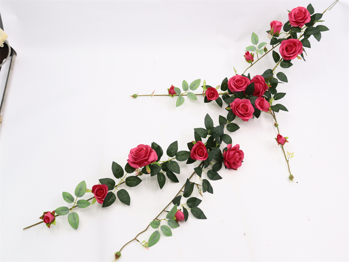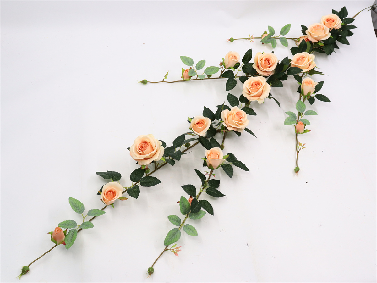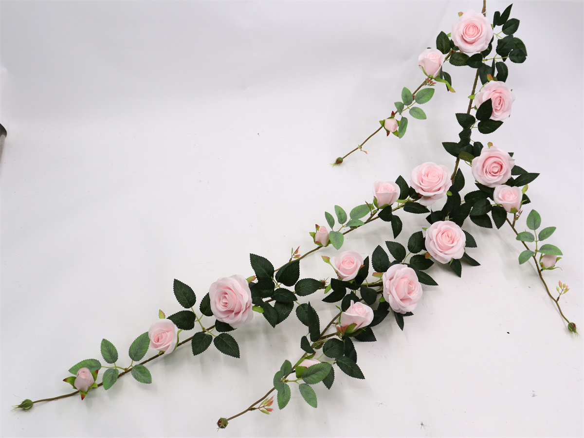 Description:160cm,rose rattan,7 large flowers dia 7.5cm,5 small flowers dia 5cm,5 buds dia 2cm,20 sets of large printed fabric leaves,5 sets of small printed fabric leaves,pongee