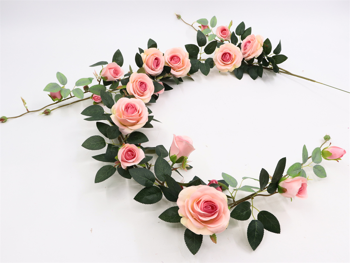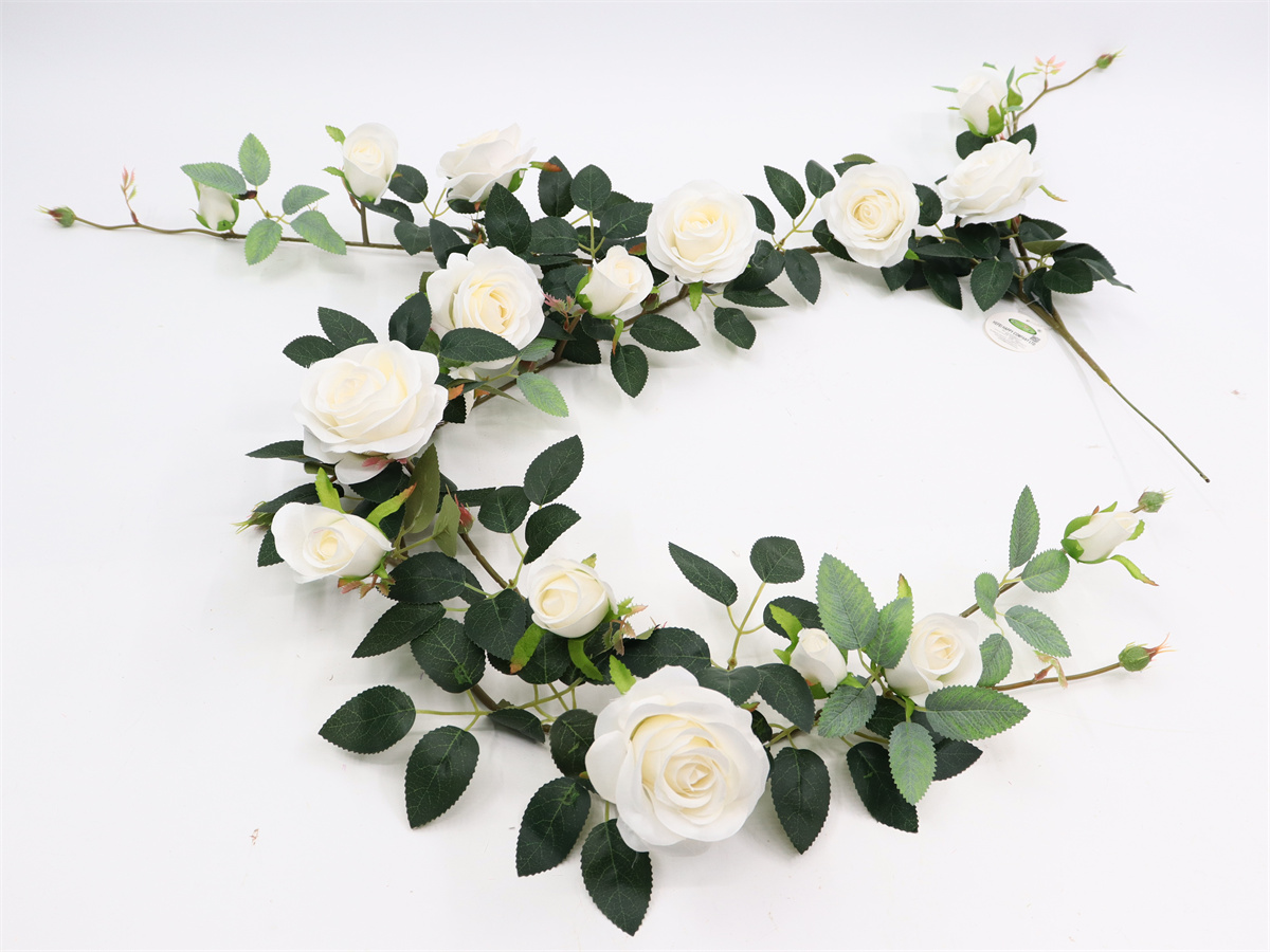 Description:169cm, rose vine, 7 large flowers, dia:8cm, 6 small flowers, dia:4cm, 5 buds, 28 sets of leaves, 17 plastic buds, pengee;