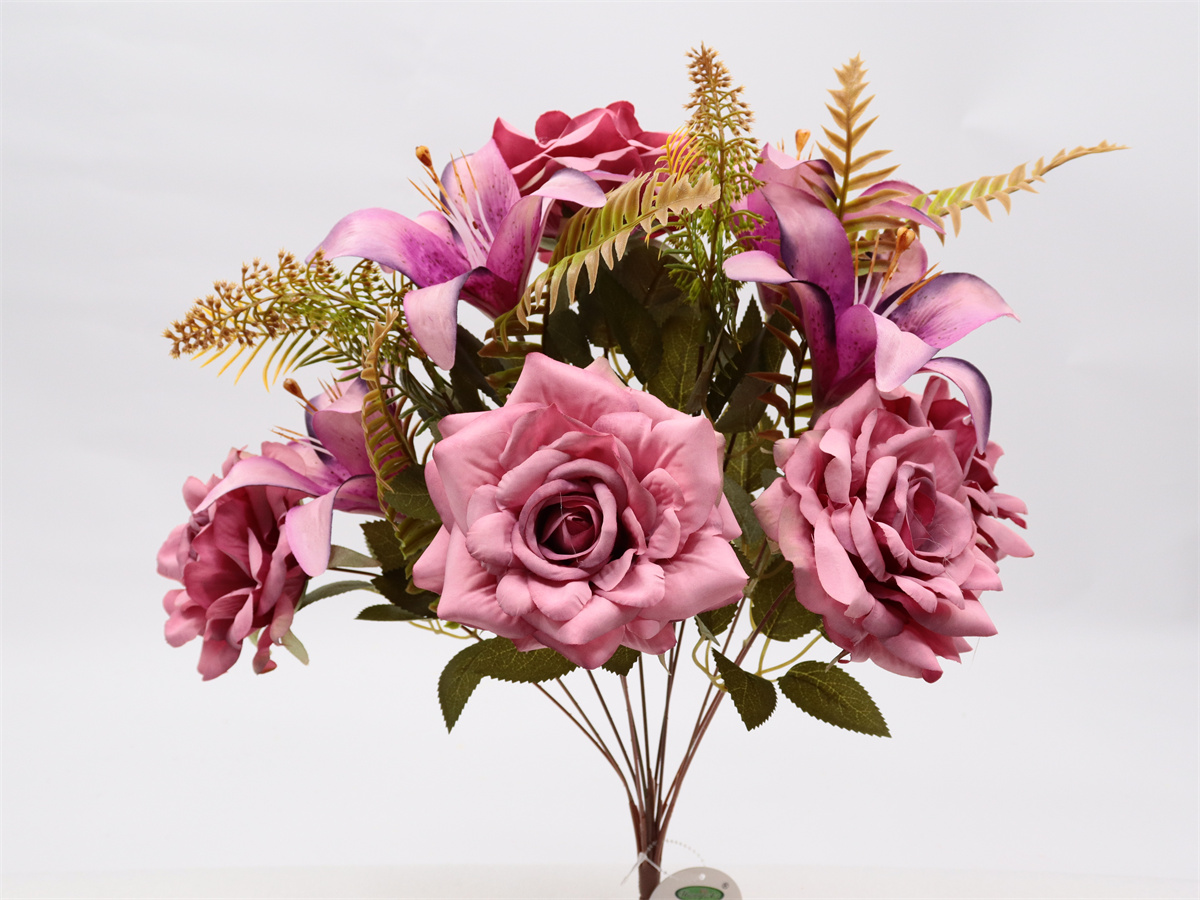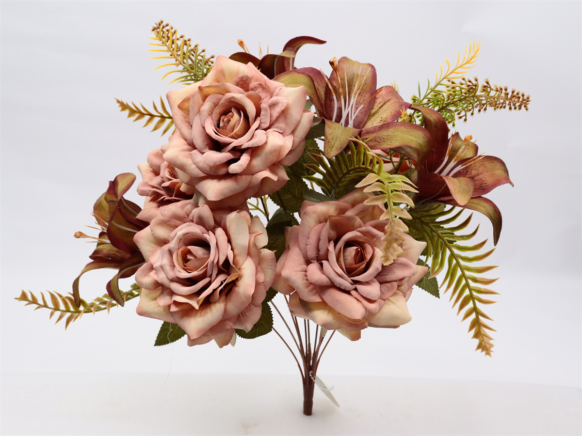 Description: 49cm,11 branch rose and lily bush,5 roses,dia 12cm,4 lilies,dia13.5cm,4 plstic fern,4 sets of plastic grass, 11 sets of fabric leaves.coating rose and satin lily