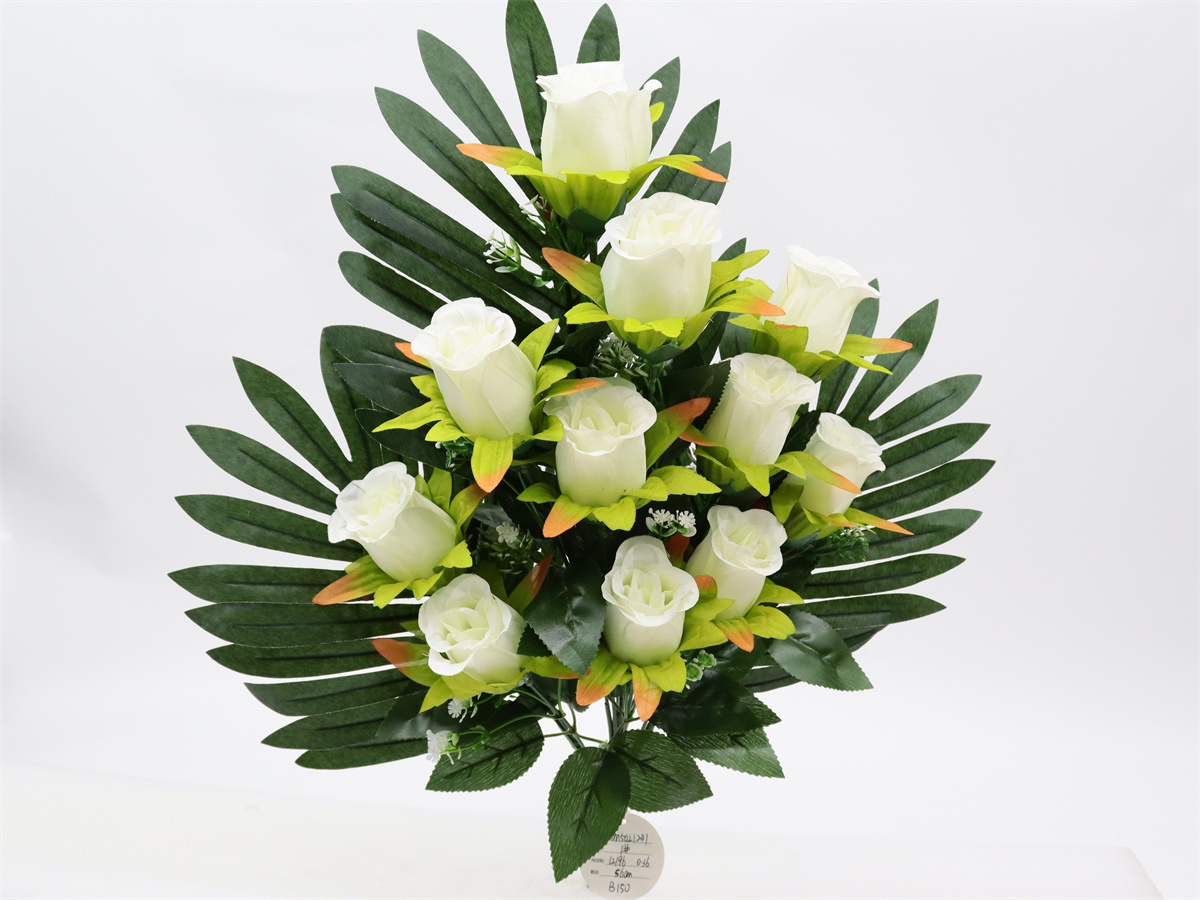 Description: 56cm,Fanshaped rose bouquet, 11 branch, 11 flowers dia: 6cm, 11 plastic grass, 10 sets glossy leaves, 3 large leaves, stain