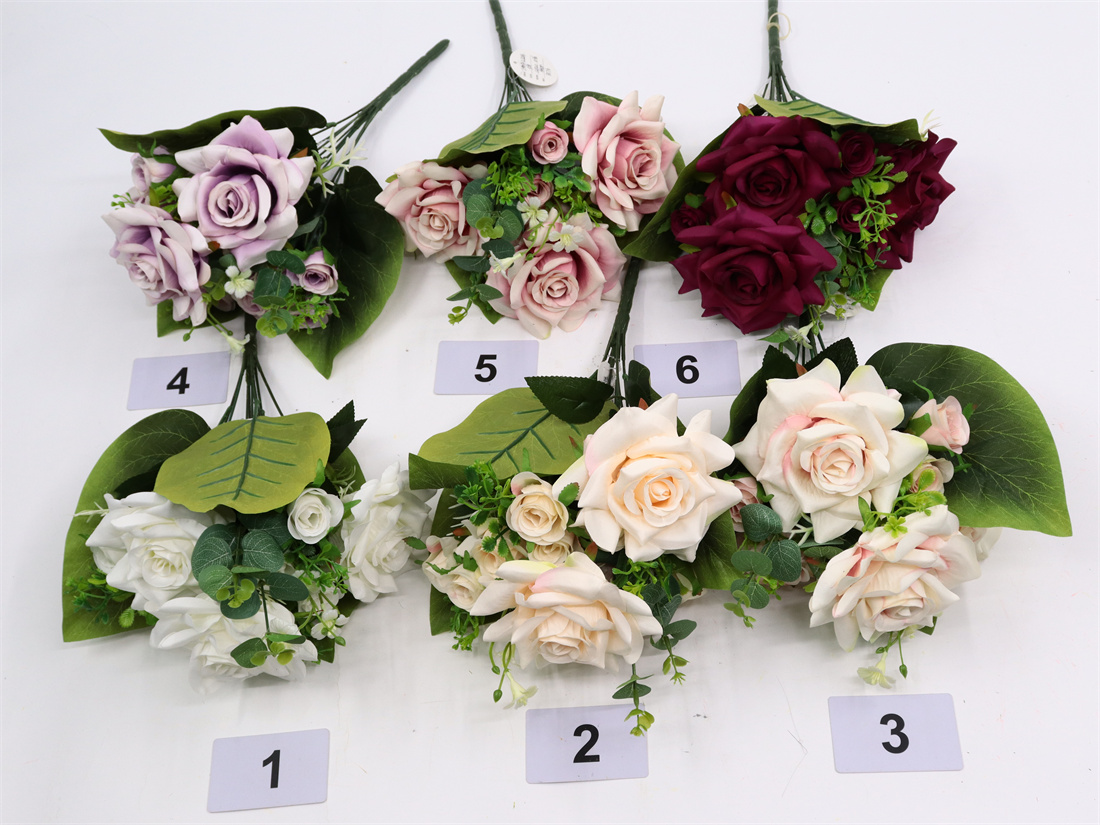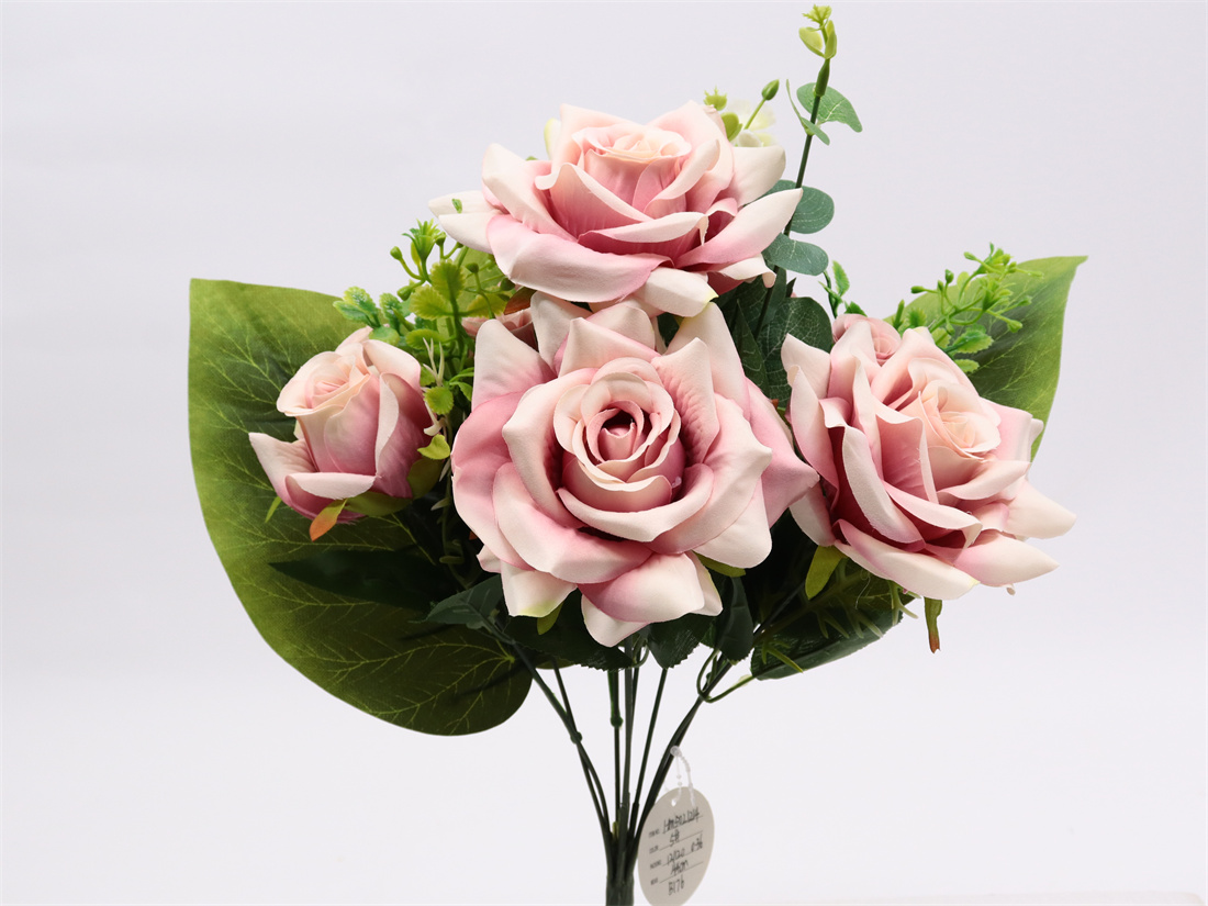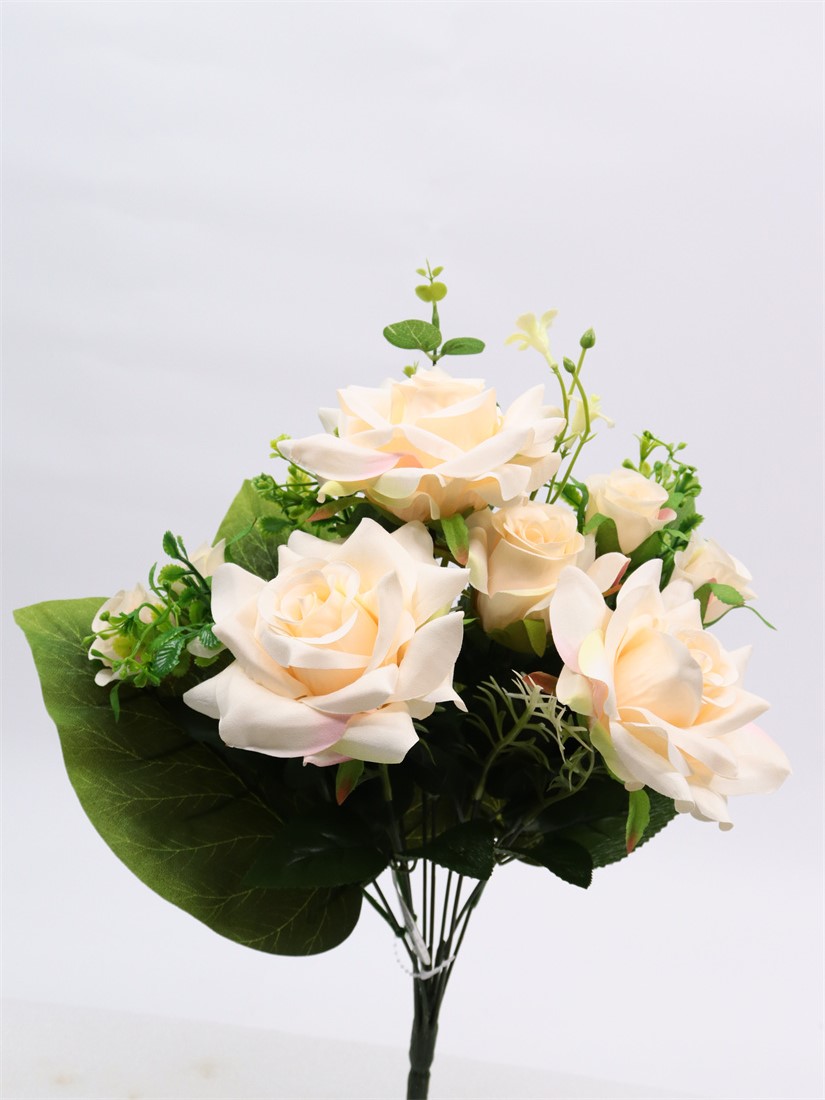 Description: 44cm,Rose bouquet,9 branch, 3 Large Flowers (pongeeµ-peach) dia: 13cm, 1 Medium Flower (pongeeµ-peach) dia: 6cm, 6 Small Flowers (pongee), 3 Plastic Grass, 1 Plastic Flower, 3 Plastic Leaves, 1 Eucalyptus Leaf, 8 Sets glossy Leaves, 3 Large Leaves