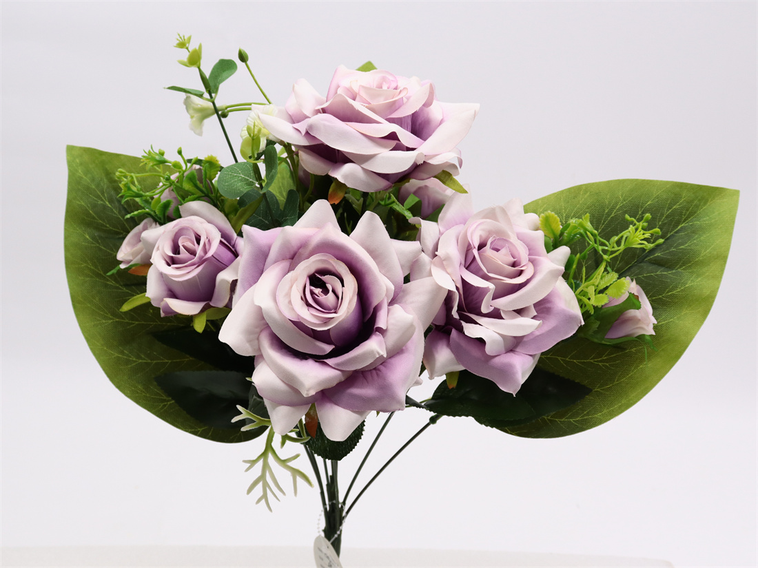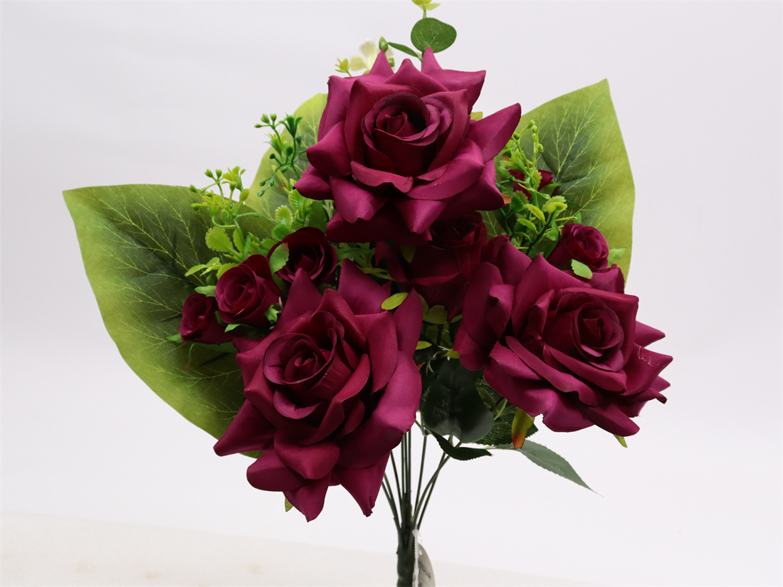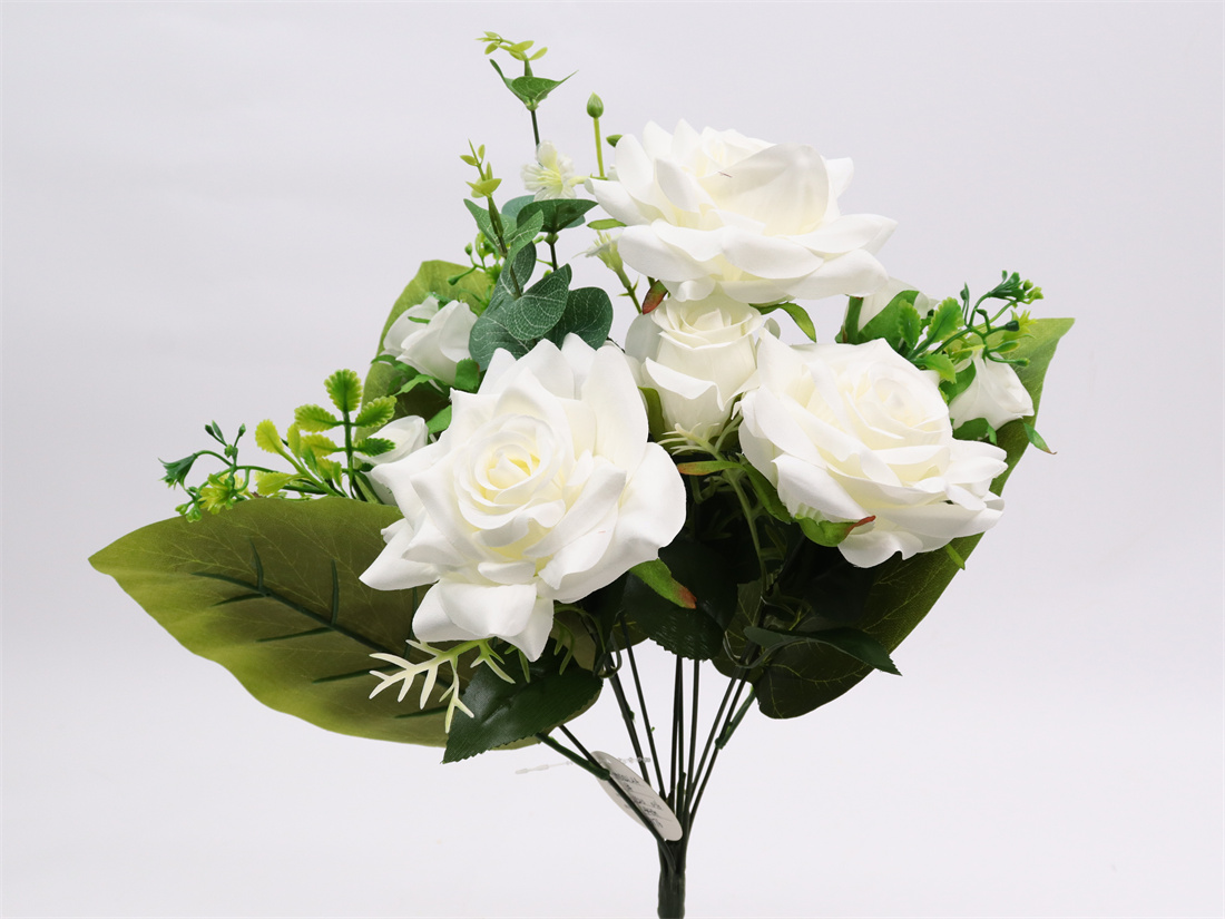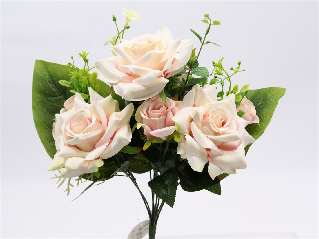 Description: 44cm,Rose bouquet,9 branch, 3 Large Flowers (pongeeµ-peach) dia: 13cm, 1 Medium Flower (pongeeµ-peach) dia: 6cm, 6 Small Flowers (pongee), 3 Plastic Grass, 1 Plastic Flower, 3 Plastic Leaves, 1 Eucalyptus Leaf, 8 Sets glossy Leaves, 3 Large Leaves