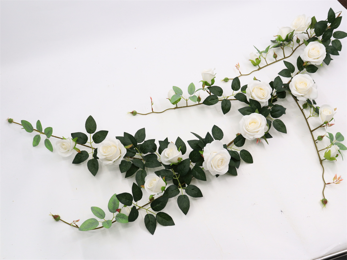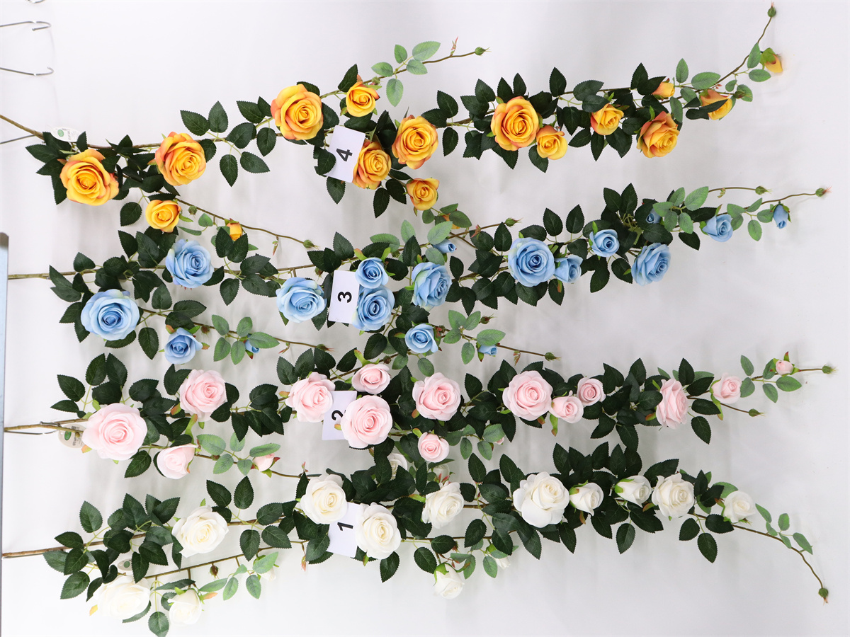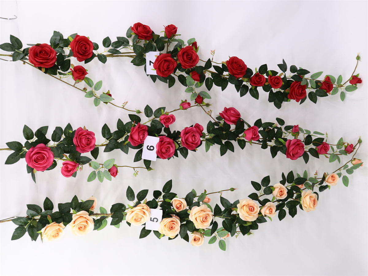 Description: 160cm,rose rattan,7 large flowers dia 7.5cm,5 small flowers dia 5cm,5 buds dia 2cm,20 sets of large printed fabric leaves,5 sets of small printed fabric leaves,pongee